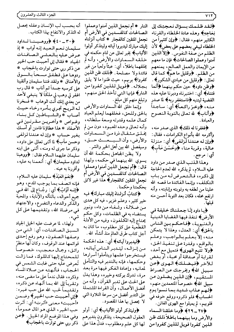 {٣٠ - ٤٠} {وَوَهَبْنَا لِدَاوُدَ سُلَيْمَانَ نِعْمَ الْعَبْدُ إِنَّهُ أَوَّابٌ * إِذْ عُرِضَ عَلَيْهِ بِالْعَشِيِّ الصَّافِنَاتُ الْجِيَادُ * فَقَالَ إِنِّي أَحْبَبْتُ حُبَّ الْخَيْرِ عَنْ ذِكْرِ رَبِّي حَتَّى تَوَارَتْ بِالْحِجَابِ * رُدُّوهَا عَلَيَّ فَطَفِقَ مَسْحًا بِالسُّوقِ وَالأعْنَاقِ * وَلَقَدْ فَتَنَّا سُلَيْمَانَ وَأَلْقَيْنَا عَلَى كُرْسِيِّهِ جَسَدًا ثُمَّ أَنَابَ * قَالَ رَبِّ اغْفِرْ لِي وَهَبْ لِي مُلْكًا لا يَنْبَغِي لأحَدٍ مِنْ بَعْدِي إِنَّكَ أَنْتَ الْوَهَّابُ * فَسَخَّرْنَا لَهُ الرِّيحَ تَجْرِي بِأَمْرِهِ رُخَاءً حَيْثُ أَصَابَ * وَالشَّيَاطِينَ كُلَّ بَنَّاءٍ وَغَوَّاصٍ * وَآخَرِينَ مُقَرَّنِينَ فِي الأصْفَادِ * هَذَا عَطَاؤُنَا فَامْنُنْ أَوْ أَمْسِكْ بِغَيْرِ حِسَابٍ * وَإِنَّ لَهُ عِنْدَنَا لَزُلْفَى وَحُسْنَ مَآبٍ} .