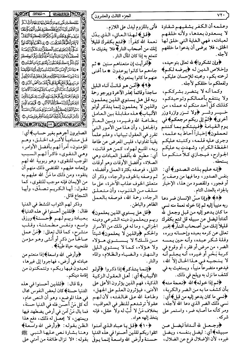 {١٠} {قُلْ يَا عِبَادِي الَّذِينَ آمَنُوا اتَّقُوا رَبَّكُمْ لِلَّذِينَ أَحْسَنُوا فِي هَذِهِ الدُّنْيَا حَسَنَةٌ وَأَرْضُ اللَّهِ وَاسِعَةٌ إِنَّمَا يُوَفَّى الصَّابِرُونَ أَجْرَهُمْ بِغَيْرِ حِسَابٍ} .
