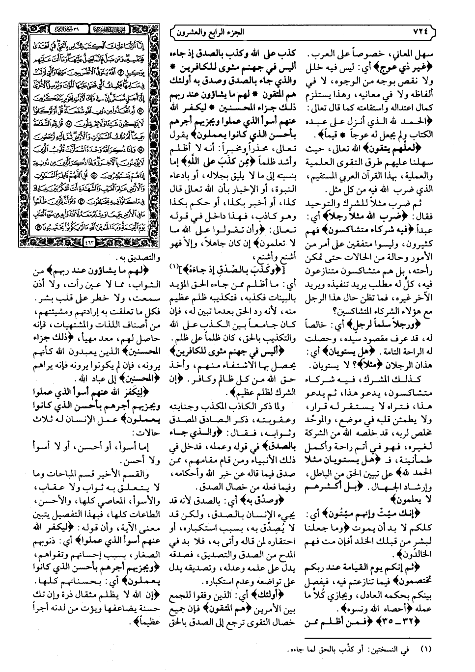 {٣٢ - ٣٥} {فَمَنْ أَظْلَمُ مِمَّنْ كَذَبَ عَلَى اللَّهِ وَكَذَّبَ بِالصِّدْقِ إِذْ جَاءَهُ أَلَيْسَ فِي جَهَنَّمَ مَثْوًى لِلْكَافِرِينَ * وَالَّذِي جَاءَ بِالصِّدْقِ وَصَدَّقَ بِهِ أُولَئِكَ هُمُ الْمُتَّقُونَ * لَهُمْ مَا يَشَاءُونَ عِنْدَ رَبِّهِمْ ذَلِكَ جَزَاءُ الْمُحْسِنِينَ * لِيُكَفِّرَ اللَّهُ عَنْهُمْ أَسْوَأَ الَّذِي عَمِلُوا وَيَجْزِيَهُمْ أَجْرَهُمْ بِأَحْسَنِ الَّذِي كَانُوا يَعْمَلُونَ} .
