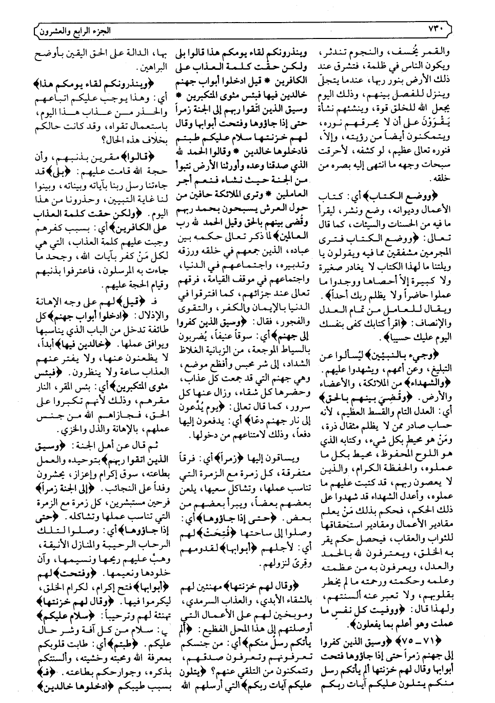 {٧١ - ٧٥} {وَسِيقَ الَّذِينَ كَفَرُوا إِلَى جَهَنَّمَ زُمَرًا حَتَّى إِذَا جَاءُوهَا فُتِحَتْ أَبْوَابُهَا وَقَالَ لَهُمْ خَزَنَتُهَا أَلَمْ يَأْتِكُمْ رُسُلٌ مِنْكُمْ يَتْلُونَ عَلَيْكُمْ آيَاتِ رَبِّكُمْ وَيُنْذِرُونَكُمْ لِقَاءَ يَوْمِكُمْ هَذَا قَالُوا بَلَى وَلَكِنْ حَقَّتْ كَلِمَةُ الْعَذَابِ عَلَى الْكَافِرِينَ * قِيلَ ادْخُلُوا أَبْوَابَ جَهَنَّمَ خَالِدِينَ فِيهَا فَبِئْسَ مَثْوَى الْمُتَكَبِّرِينَ * وَسِيقَ الَّذِينَ اتَّقَوْا رَبَّهُمْ إِلَى الْجَنَّةِ زُمَرًا حَتَّى إِذَا جَاءُوهَا وَفُتِحَتْ أَبْوَابُهَا وَقَالَ لَهُمْ خَزَنَتُهَا سَلامٌ عَلَيْكُمْ طِبْتُمْ فَادْخُلُوهَا خَالِدِينَ * وَقَالُوا الْحَمْدُ لِلَّهِ الَّذِي صَدَقَنَا وَعْدَهُ وَأَوْرَثَنَا الأرْضَ نَتَبَوَّأُ مِنَ الْجَنَّةِ حَيْثُ نَشَاءُ فَنِعْمَ أَجْرُ الْعَامِلِينَ} .