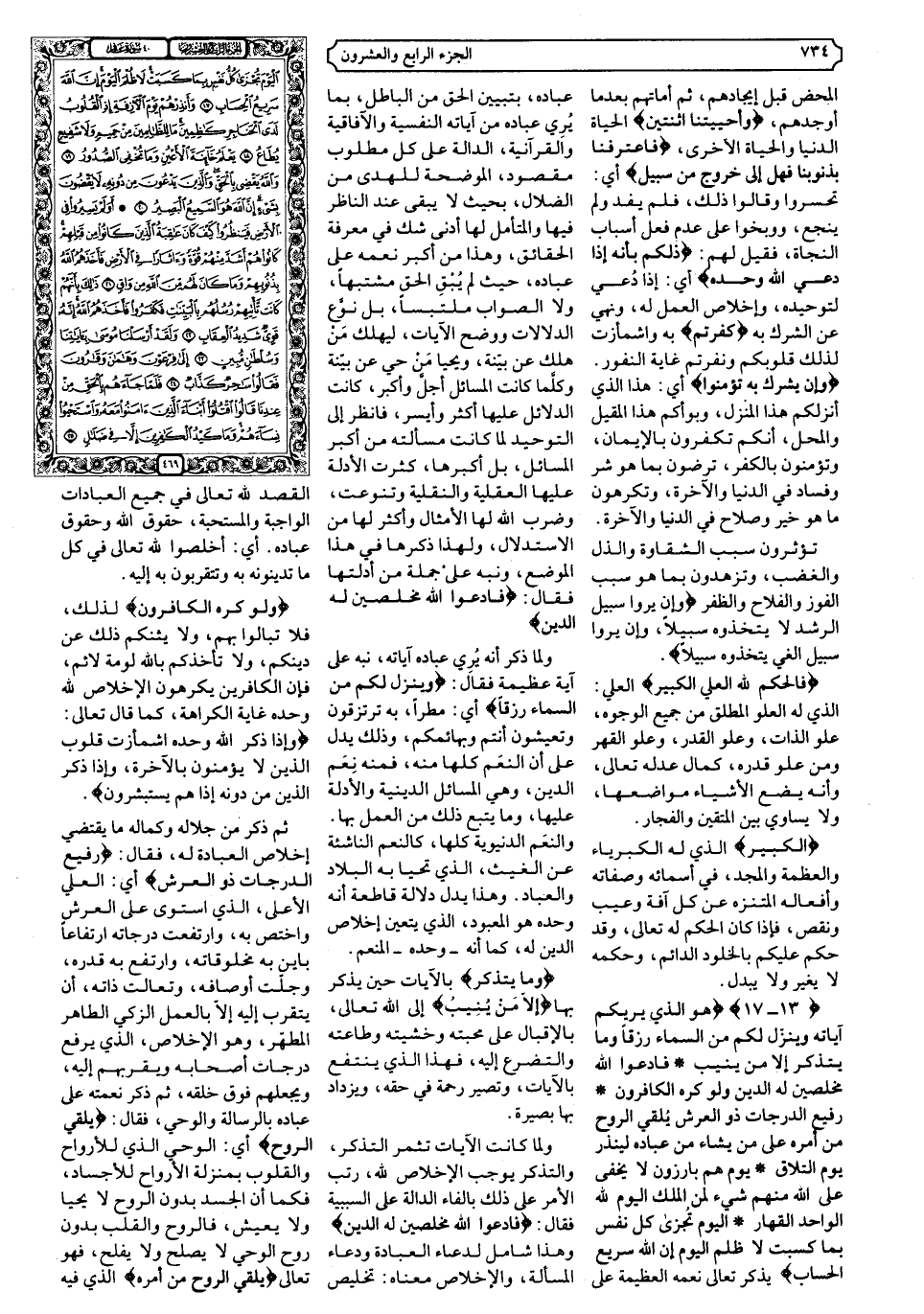 ثم ذكر من جلاله وكماله ما يقتضي إخلاص العبادة له فقال: {رَفِيعُ الدَّرَجَاتِ ذُو الْعَرْشِ} أي: العلي الأعلى، الذي استوى على العرش واختص به، وارتفعت درجاته ارتفاعًا باين به مخلوقاته، وارتفع به قدره، وجلت أوصافه، وتعالت ذاته، أن يتقرب إليه إلا بالعمل الزكي الطاهر المطهر، وهو الإخلاص، الذي يرفع درجات أصحابه ويقربهم إليه ويجعلهم فوق خلقه، ثم ذكر نعمته على عباده بالرسالة والوحي، فقال: {يُلْقِي الرُّوحَ} أي: الوحي الذي للأرواح والقلوب بمنزلة الأرواح للأجساد، فكما أن الجسد بدون الروح لا يحيا ولا يعيش، فالروح والقلب بدون روح الوحي لا يصلح ولا يفلح، فهو تعالى {يُلْقِي الرُّوحَ مِنْ أَمْرِهِ} الذي فيه ⦗٧٣٥⦘ نفع العباد ومصلحتهم.