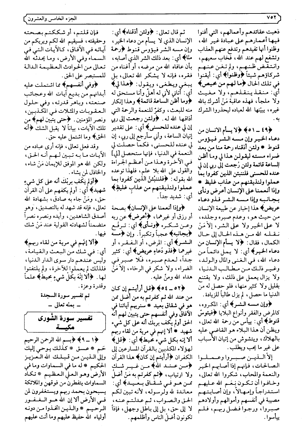 {١-٩} {بِسْمِ اللَّهِ الرَّحْمَنِ الرَّحِيمِ حم * عسق * كَذَلِكَ يُوحِي إِلَيْكَ وَإِلَى الَّذِينَ مِنْ قَبْلِكَ اللَّهُ الْعَزِيزُ الْحَكِيمُ * لَهُ مَا فِي السَّمَاوَاتِ وَمَا فِي الأرْضِ وَهُوَ الْعَلِيُّ الْعَظِيمُ * تَكَادُ السَّمَاوَاتُ يَتَفَطَّرْنَ مِنْ فَوْقِهِنَّ وَالْمَلائِكَةُ يُسَبِّحُونَ بِحَمْدِ رَبِّهِمْ وَيَسْتَغْفِرُونَ لِمَنْ فِي الأرْضِ أَلا إِنَّ اللَّهَ هُوَ الْغَفُورُ الرَّحِيمُ * وَالَّذِينَ اتَّخَذُوا مِنْ دُونِهِ أَولِيَاءَ اللَّهُ حَفِيظٌ عَلَيْهِمْ وَمَا أَنْتَ عَلَيْهِمْ بِوَكِيلٍ * وَكَذَلِكَ أَوْحَيْنَا إِلَيْكَ قُرْآنًا عَرَبِيًّا لِتُنْذِرَ أُمَّ الْقُرَى وَمَنْ حَوْلَهَا وَتُنْذِرَ يَوْمَ الْجَمْعِ لا رَيْبَ فِيهِ فَرِيقٌ فِي الْجَنَّةِ وَفَرِيقٌ فِي السَّعِيرِ * وَلَوْ شَاءَ اللَّهُ لَجَعَلَهُمْ أُمَّةً وَاحِدَةً وَلَكِنْ يُدْخِلُ مَنْ يَشَاءُ فِي رَحْمَتِهِ وَالظَّالِمُونَ مَا لَهُمْ مِنْ وَلِيٍّ وَلا نَصِيرٍ * أَمِ اتَّخَذُوا مِنْ دُونِهِ أَوْلِيَاءَ فَاللَّهُ هُوَ الْوَلِيُّ وَهُوَ يُحْيِي الْمَوْتَى وَهُوَ عَلَى كُلِّ شَيْءٍ قَدِيرٌ} . ⦗٧٥٣⦘