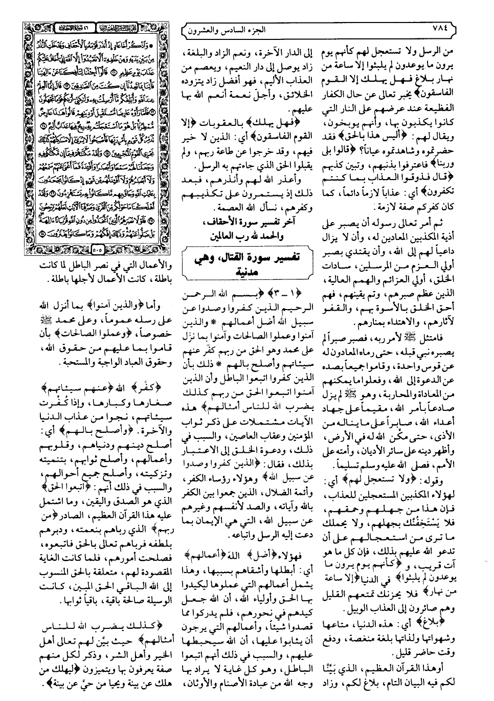 {١-٣} {بِسْمِ اللَّهِ الرَّحْمَنِ الرَّحِيمِ الَّذِينَ كَفَرُوا وَصَدُّوا عَنْ سَبِيلِ اللَّهِ أَضَلَّ أَعْمَالَهُمْ * وَالَّذِينَ آمَنُوا وَعَمِلُوا الصَّالِحَاتِ وَآمَنُوا بِمَا نُزِّلَ عَلَى مُحَمَّدٍ وَهُوَ الْحَقُّ مِنْ رَبِّهِمْ كَفَّرَ عَنْهُمْ سَيِّئَاتِهِمْ وَأَصْلَحَ بَالَهُمْ * ذَلِكَ بِأَنَّ الَّذِينَ كَفَرُوا اتَّبَعُوا الْبَاطِلَ وَأَنَّ الَّذِينَ آمَنُوا اتَّبَعُوا الْحَقَّ مِنْ رَبِّهِمْ كَذَلِكَ يَضْرِبُ اللَّهُ لِلنَّاسِ أَمْثَالَهُمْ} .