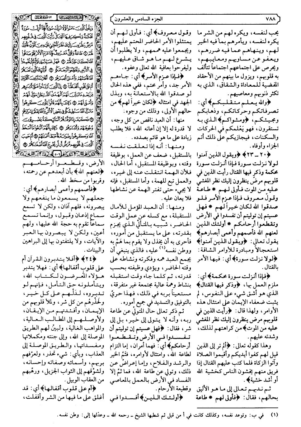 {٢٠-٢٣} {وَيَقُولُ الَّذِينَ آمَنُوا لَوْلا نُزِّلَتْ سُورَةٌ فَإِذَا أُنْزِلَتْ سُورَةٌ مُحْكَمَةٌ وَذُكِرَ فِيهَا الْقِتَالُ رَأَيْتَ الَّذِينَ فِي قُلُوبِهِمْ مَرَضٌ يَنْظُرُونَ إِلَيْكَ نَظَرَ الْمَغْشِيِّ عَلَيْهِ مِنَ الْمَوْتِ فَأَوْلَى لَهُمْ * طَاعَةٌ وَقَوْلٌ مَعْرُوفٌ فَإِذَا عَزَمَ الأمْرُ فَلَوْ صَدَقُوا اللَّهَ لَكَانَ خَيْرًا لَهُمْ * فَهَلْ عَسَيْتُمْ إِنْ تَوَلَّيْتُمْ أَنْ تُفْسِدُوا فِي الأرْضِ وَتُقَطِّعُوا أَرْحَامَكُمْ * أُولَئِكَ الَّذِينَ لَعَنَهُمُ اللَّهُ فَأَصَمَّهُمْ وَأَعْمَى أَبْصَارَهُمْ} .