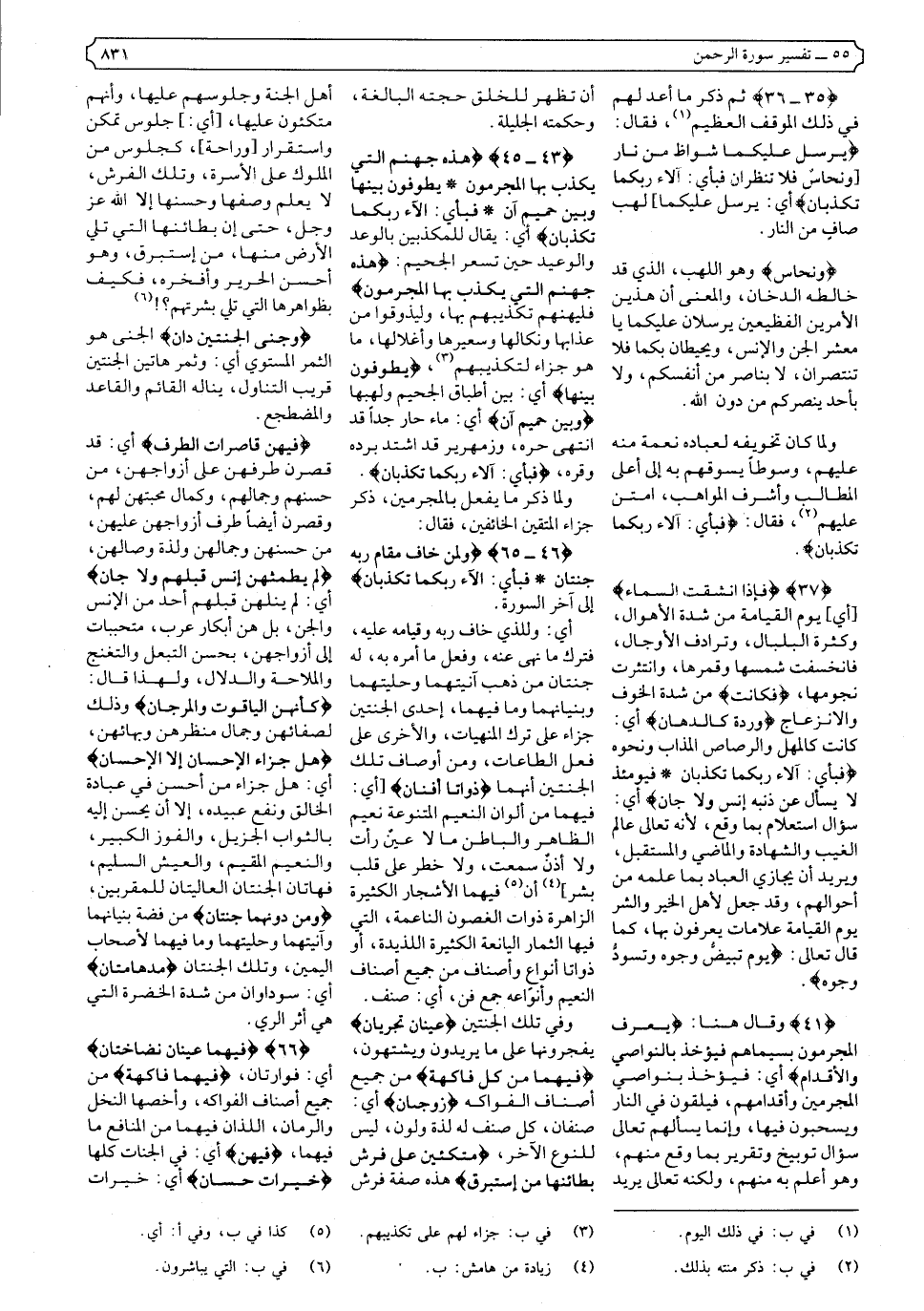 {٤٦-٦٥} {وَلِمَنْ خَافَ مَقَامَ رَبِّهِ جَنَّتَانِ * فَبِأَيِّ آلاءِ رَبِّكُمَا تُكَذِّبَانِ * ذَوَاتَا أَفْنَانٍ * فَبِأَيِّ آلاءِ رَبِّكُمَا تُكَذِّبَانِ * فِيهِمَا عَيْنَانِ تَجْرِيَانِ * فَبِأَيِّ آلاءِ رَبِّكُمَا تُكَذِّبَانِ * فِيهِمَا مِنْ كُلِّ فَاكِهَةٍ زَوْجَانِ * فَبِأَيِّ آلاءِ رَبِّكُمَا تُكَذِّبَانِ * مُتَّكِئِينَ عَلَى فُرُشٍ بَطَائِنُهَا مِنْ إِسْتَبْرَقٍ وَجَنَى الْجَنَّتَيْنِ دَانٍ * فَبِأَيِّ آلاءِ رَبِّكُمَا تُكَذِّبَانِ * فِيهِنَّ قَاصِرَاتُ الطَّرْفِ لَمْ يَطْمِثْهُنَّ إِنْسٌ قَبْلَهُمْ وَلا جَانٌّ * فَبِأَيِّ آلاءِ رَبِّكُمَا تُكَذِّبَانِ * كَأَنَّهُنَّ الْيَاقُوتُ وَالْمَرْجَانُ * فَبِأَيِّ آلاءِ رَبِّكُمَا تُكَذِّبَانِ * هَلْ جَزَاءُ الإحْسَانِ إِلا الإحْسَانُ * فَبِأَيِّ آلاءِ رَبِّكُمَا تُكَذِّبَانِ * وَمِنْ دُونِهِمَا جَنَّتَانِ * فَبِأَيِّ آلاءِ رَبِّكُمَا تُكَذِّبَانِ * مُدْهَامَّتَانِ * فَبِأَيِّ آلاءِ رَبِّكُمَا تُكَذِّبَانِ} إلى آخر السورة.