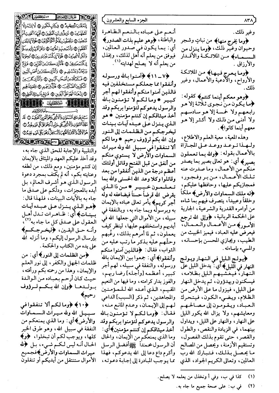 {٧-١١} {آمِنُوا بِاللَّهِ وَرَسُولِهِ وَأَنْفِقُوا مِمَّا جَعَلَكُمْ مُسْتَخْلَفِينَ فِيهِ فَالَّذِينَ آمَنُوا مِنْكُمْ وَأَنْفَقُوا لَهُمْ أَجْرٌ كَبِيرٌ * وَمَا لَكُمْ لا تُؤْمِنُونَ بِاللَّهِ وَالرَّسُولُ يَدْعُوكُمْ لِتُؤْمِنُوا بِرَبِّكُمْ وَقَدْ أَخَذَ مِيثَاقَكُمْ إِنْ كُنْتُمْ مُؤْمِنِينَ * هُوَ الَّذِي يُنَزِّلُ عَلَى عَبْدِهِ آيَاتٍ بَيِّنَاتٍ لِيُخْرِجَكُمْ مِنَ الظُّلُمَاتِ إِلَى النُّورِ وَإِنَّ اللَّهَ بِكُمْ لَرَءُوفٌ رَحِيمٌ * وَمَا لَكُمْ أَلا تُنْفِقُوا فِي سَبِيلِ اللَّهِ وَلِلَّهِ مِيرَاثُ السَّمَاوَاتِ وَالأرْضِ لا يَسْتَوِي مِنْكُمْ مَنْ أَنْفَقَ مِنْ قَبْلِ الْفَتْحِ وَقَاتَلَ أُولَئِكَ أَعْظَمُ دَرَجَةً مِنَ الَّذِينَ أَنْفَقُوا مِنْ بَعْدُ وَقَاتَلُوا وَكُلا وَعَدَ اللَّهُ الْحُسْنَى وَاللَّهُ بِمَا تَعْمَلُونَ خَبِيرٌ * مَنْ ذَا الَّذِي يُقْرِضُ اللَّهَ قَرْضًا حَسَنًا فَيُضَاعِفَهُ لَهُ وَلَهُ أَجْرٌ كَرِيمٌ} .