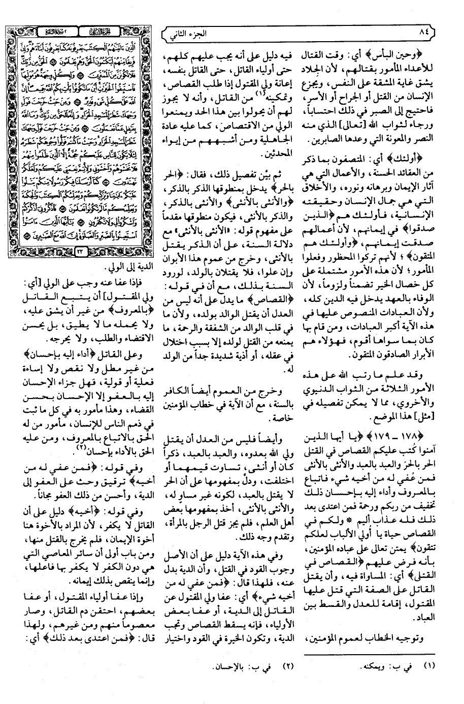{١٧٨ - ١٧٩} {يَا أَيُّهَا الَّذِينَ آمَنُوا كُتِبَ عَلَيْكُمُ الْقِصَاصُ فِي الْقَتْلَى الْحُرُّ بِالْحُرِّ وَالْعَبْدُ بِالْعَبْدِ وَالأنْثَى بِالأنْثَى فَمَنْ عُفِيَ لَهُ مِنْ أَخِيهِ شَيْءٌ فَاتِّبَاعٌ بِالْمَعْرُوفِ وَأَدَاءٌ إِلَيْهِ بِإِحْسَانٍ ذَلِكَ تَخْفِيفٌ مِنْ رَبِّكُمْ وَرَحْمَةٌ فَمَنِ اعْتَدَى بَعْدَ ذَلِكَ فَلَهُ عَذَابٌ أَلِيمٌ * وَلَكُمْ فِي الْقِصَاصِ حَيَاةٌ يَا أُولِي الألْبَابِ لَعَلَّكُمْ تَتَّقُونَ} .