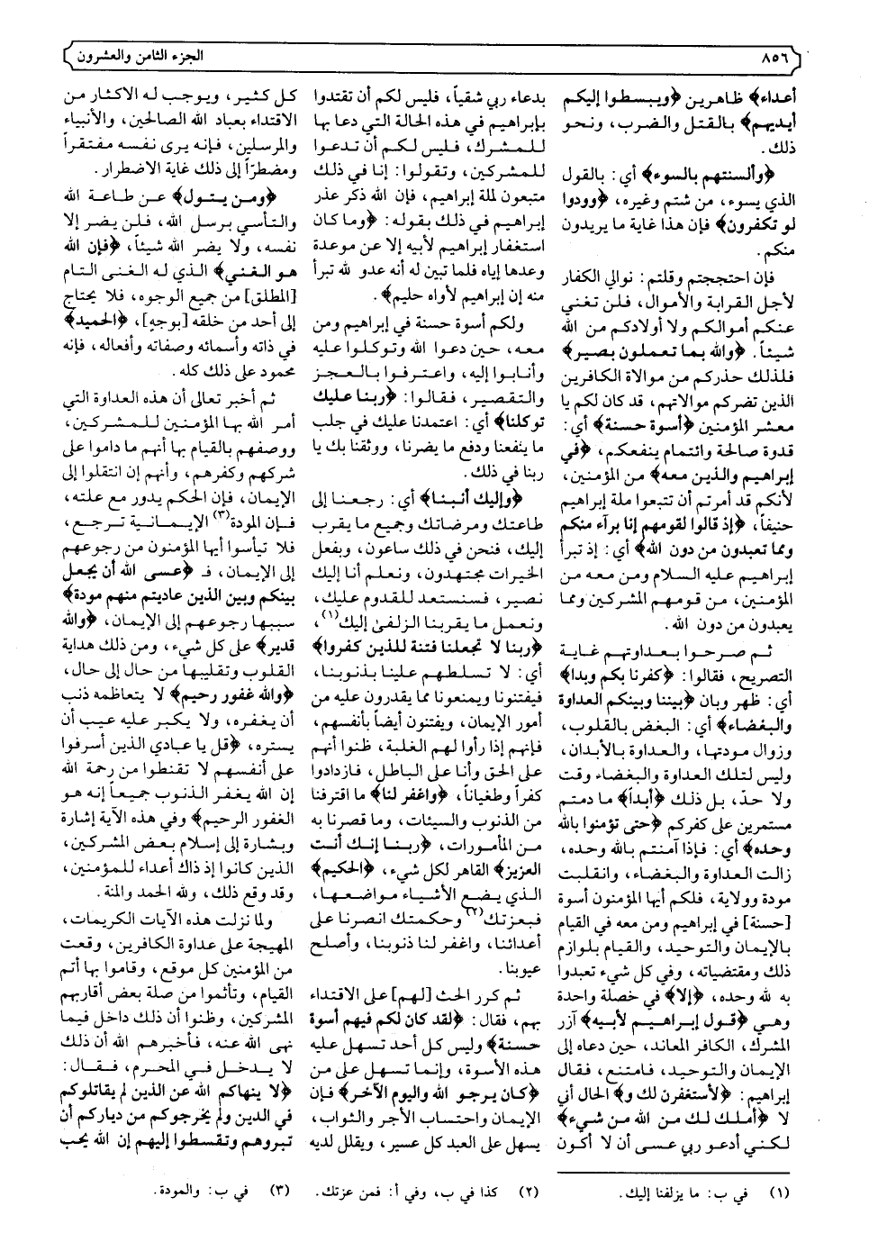 {لَقَدْ كَانَ لَكُمْ فِيهِمْ أُسْوَةٌ حَسَنَةٌ لِمَنْ كَانَ يَرْجُو اللَّهَ وَالْيَوْمَ الآخِرَ وَمَنْ يَتَوَلَّ فَإِنَّ اللَّهَ هُوَ الْغَنِيُّ الْحَمِيدُ * عَسَى اللَّهُ أَنْ يَجْعَلَ بَيْنَكُمْ وَبَيْنَ الَّذِينَ عَادَيْتُمْ مِنْهُمْ مَوَدَّةً وَاللَّهُ قَدِيرٌ وَاللَّهُ غَفُورٌ رَحِيمٌ * لا يَنْهَاكُمُ اللَّهُ عَنِ الَّذِينَ لَمْ يُقَاتِلُوكُمْ فِي الدِّينِ وَلَمْ يُخْرِجُوكُمْ مِنْ دِيَارِكُمْ أَنْ تَبَرُّوهُمْ وَتُقْسِطُوا إِلَيْهِمْ إِنَّ اللَّهَ يُحِبُّ الْمُقْسِطِينَ * إِنَّمَا يَنْهَاكُمُ اللَّهُ عَنِ الَّذِينَ قَاتَلُوكُمْ فِي الدِّينِ وَأَخْرَجُوكُمْ مِنْ دِيَارِكُمْ وَظَاهَرُوا عَلَى إِخْرَاجِكُمْ أَنْ تَوَلَّوْهُمْ وَمَنْ يَتَوَلَّهُمْ فَأُولَئِكَ هُمُ الظَّالِمُونَ} .