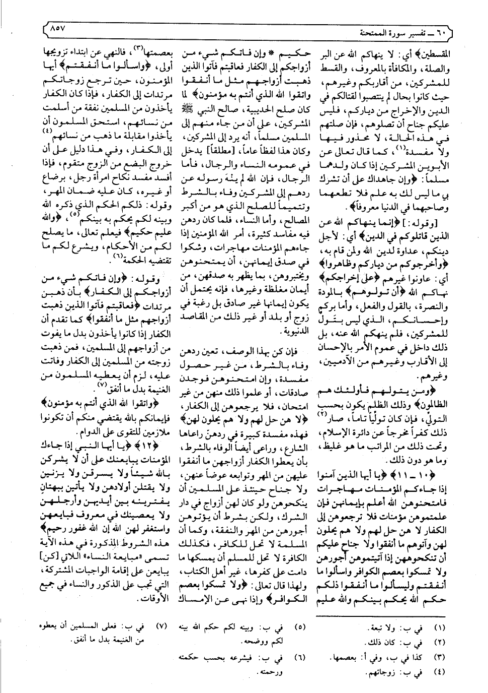 {١٠-١١} {يَا أَيُّهَا الَّذِينَ آمَنُوا إِذَا جَاءَكُمُ الْمُؤْمِنَاتُ مُهَاجِرَاتٍ فَامْتَحِنُوهُنَّ اللَّهُ أَعْلَمُ بِإِيمَانِهِنَّ فَإِنْ عَلِمْتُمُوهُنَّ مُؤْمِنَاتٍ فَلا تَرْجِعُوهُنَّ إِلَى الْكُفَّارِ لا هُنَّ حِلٌّ لَهُمْ وَلا هُمْ يَحِلُّونَ لَهُنَّ وَآتُوهُمْ مَا أَنْفَقُوا وَلا جُنَاحَ عَلَيْكُمْ أَنْ تَنْكِحُوهُنَّ إِذَا آتَيْتُمُوهُنَّ أُجُورَهُنَّ وَلا تُمْسِكُوا بِعِصَمِ الْكَوَافِرِ وَاسْأَلُوا مَا أَنْفَقْتُمْ وَلْيَسْأَلُوا مَا أَنْفَقُوا ذَلِكُمْ حُكْمُ اللَّهِ يَحْكُمُ بَيْنَكُمْ وَاللَّهُ عَلِيمٌ حَكِيمٌ * وَإِنْ فَاتَكُمْ شَيْءٌ مِنْ أَزْوَاجِكُمْ إِلَى الْكُفَّارِ فَعَاقَبْتُمْ فَآتُوا الَّذِينَ ذَهَبَتْ أَزْوَاجُهُمْ مِثْلَ مَا أَنْفَقُوا وَاتَّقُوا اللَّهَ الَّذِي أَنْتُمْ بِهِ مُؤْمِنُونَ} .