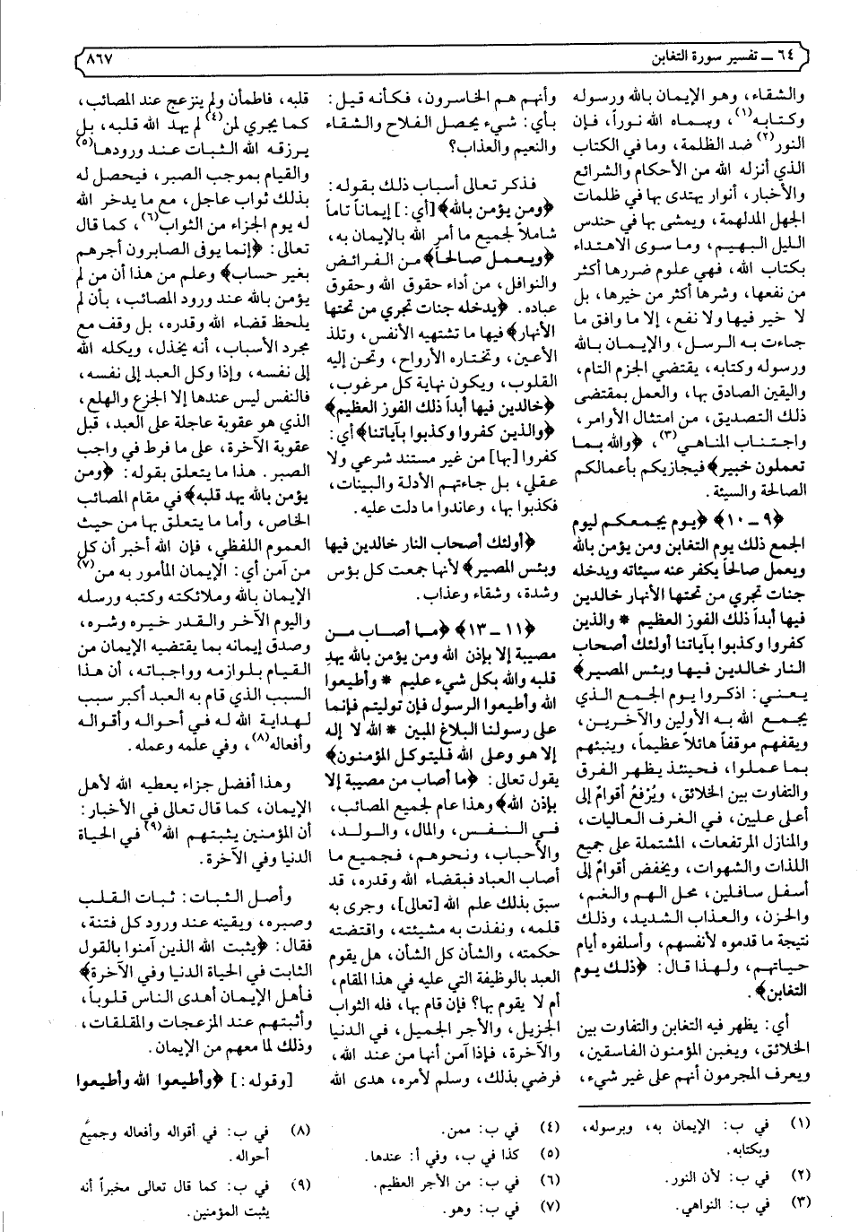 {١١-١٣} {مَا أَصَابَ مِنْ مُصِيبَةٍ إِلا بِإِذْنِ اللَّهِ وَمَنْ يُؤْمِنْ بِاللَّهِ يَهْدِ قَلْبَهُ وَاللَّهُ بِكُلِّ شَيْءٍ عَلِيمٌ * وَأَطِيعُوا اللَّهَ وَأَطِيعُوا الرَّسُولَ فَإِنْ تَوَلَّيْتُمْ فَإِنَّمَا عَلَى رَسُولِنَا الْبَلاغُ الْمُبِينُ * اللَّهُ لا إِلَهَ إِلا هُوَ وَعَلَى اللَّهِ فَلْيَتَوَكَّلِ الْمُؤْمِنُونَ} .