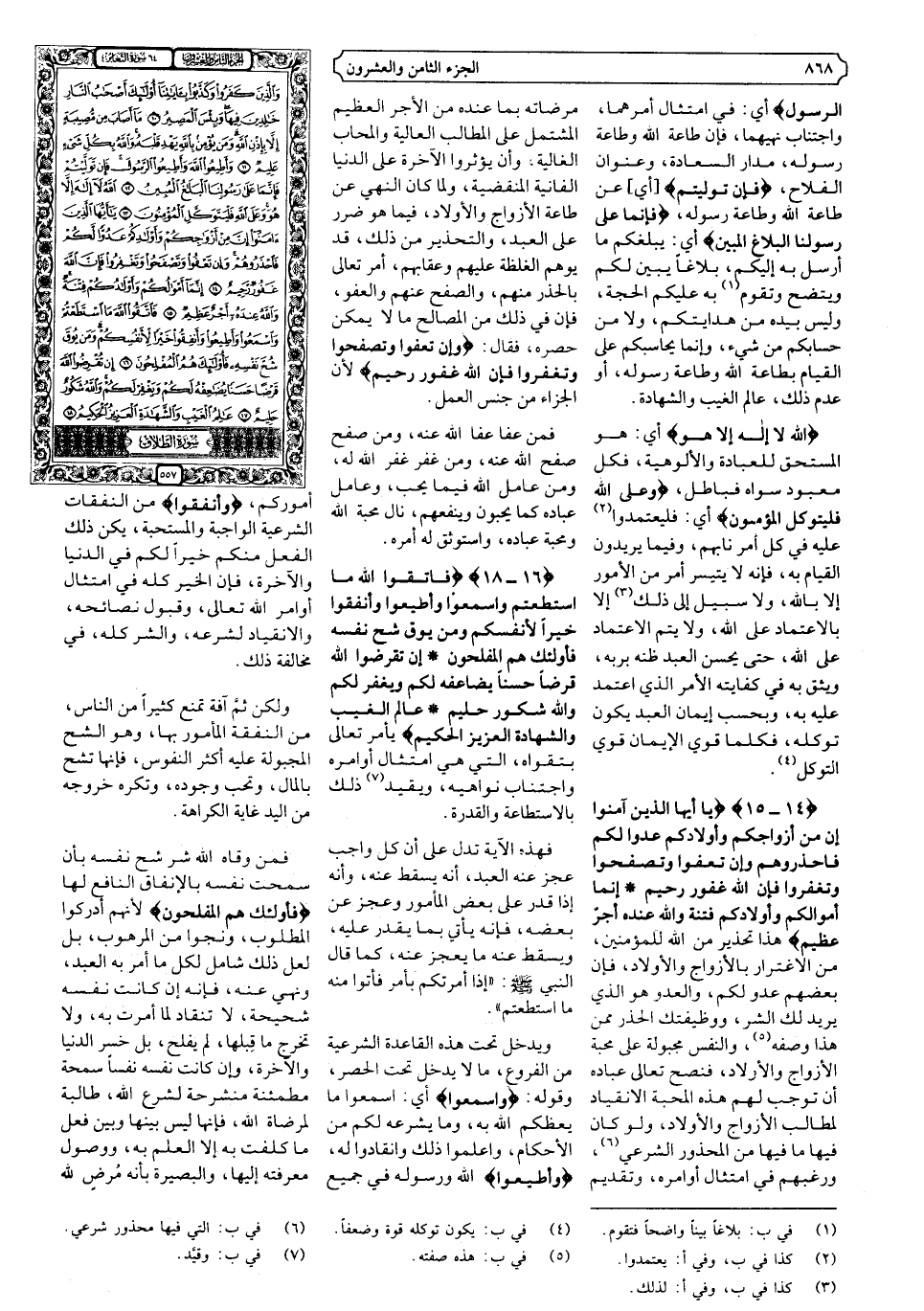 فمن وقاه الله شر شح نفسه بأن سمحت نفسه بالإنفاق النافع لها {فَأُولَئِكَ هُمُ الْمُفْلِحُونَ} لأنهم أدركوا المطلوب، ونجوا من المرهوب، بل لعل ذلك شامل لكل ما أمر به العبد، ونهي عنه، فإنه إن كانت نفسه شحيحة، لا تنقاد لما أمرت به، ولا تخرج ما قِبلها، لم يفلح، بل خسر الدنيا والآخرة، وإن كانت نفسه نفسًا سمحة، مطمئنة، منشرحة لشرع الله، طالبة لمرضاة، فإنها ليس بينها وبين فعل ما كلفت به إلا العلم به، ووصول معرفته إليها، والبصيرة بأنه مرض لله ⦗٨٦٩⦘ تعالى، وبذلك تفلح وتنجح وتفوز كل الفوز.