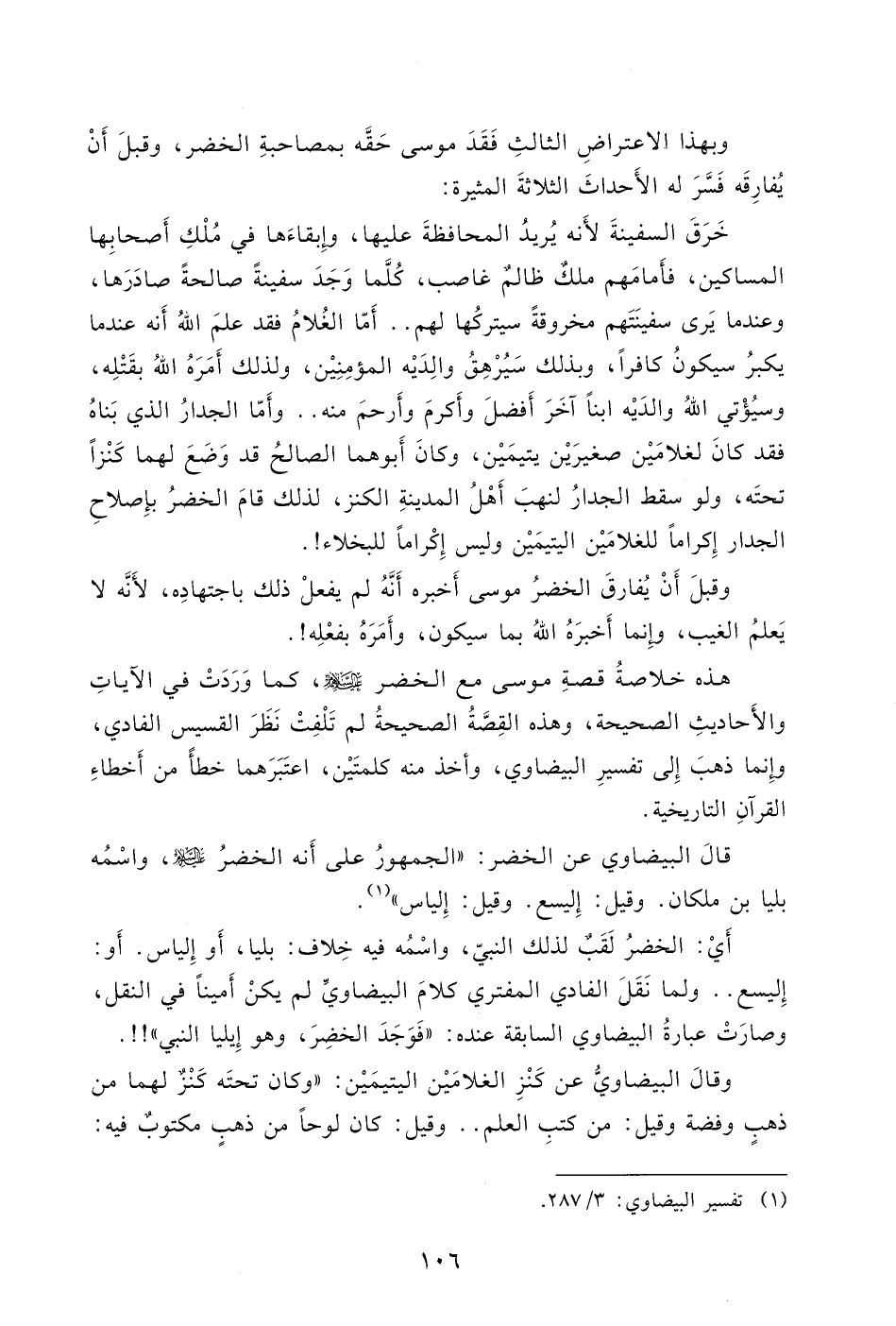 هذه خلاصةُ قصةِ موسى مع الخضر - عليهما السلام -، كما وَرَدَتْ في الآياتِ والأَحاديثِ الصحيحة، وهذه القِصَّةُ الصحيحةُ لم تَلْفِتْ نَظَرَ القسيس الفادي، وإِنما ذهبَ إِلى تفسيرِ البيضاوي، وأخذ منه كلمتَيْن، اعتَبَرَهما خطأً من أَخطاءِ القرآنِ التاريخية.