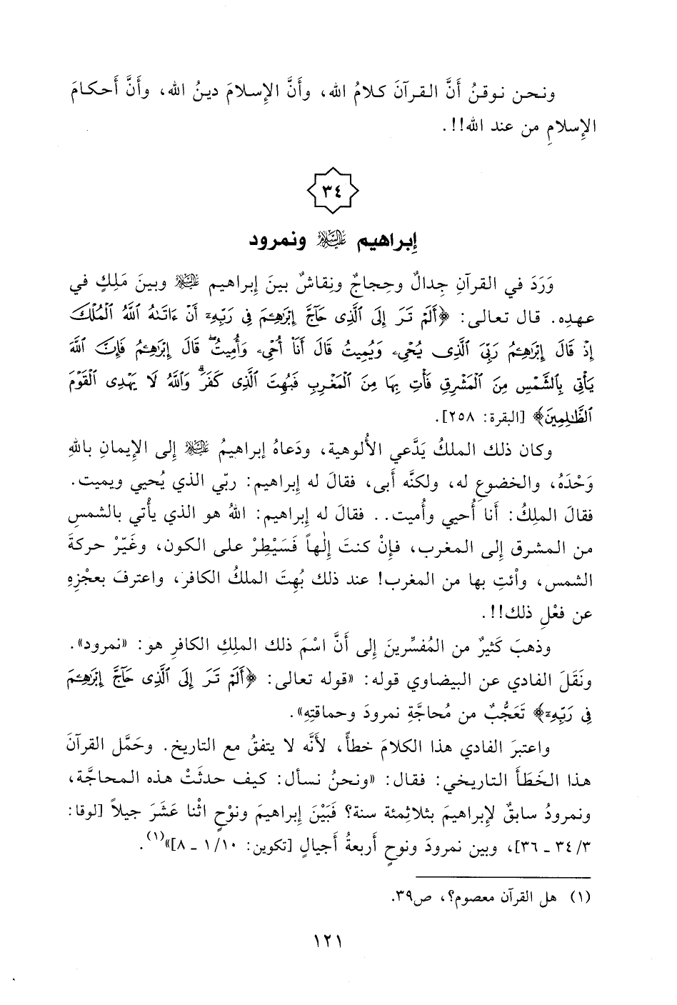 وحَمَّل القرآنَ هذا الخَطَأَ التاريخي: فقال: " ونحنُ نسأل: كيف حدثَتْ هذه المحاجَّة، ونمرودُ سابقٌ لإِبراهيمَ بثلاثِمئة سنة؟