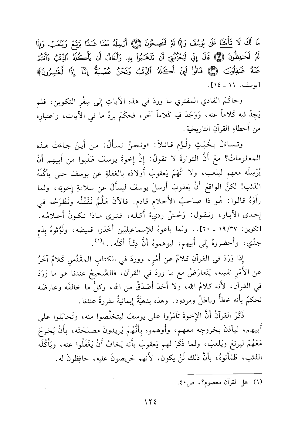 يَجِدْ فيه كَلاماً عنه، وَوَجَدَ فيه كَلاماً آخَر، فحكَمَ بردِّ ما في الآيات، واعتبارِه من أَخطاءِ القرآنِ التاريخية.