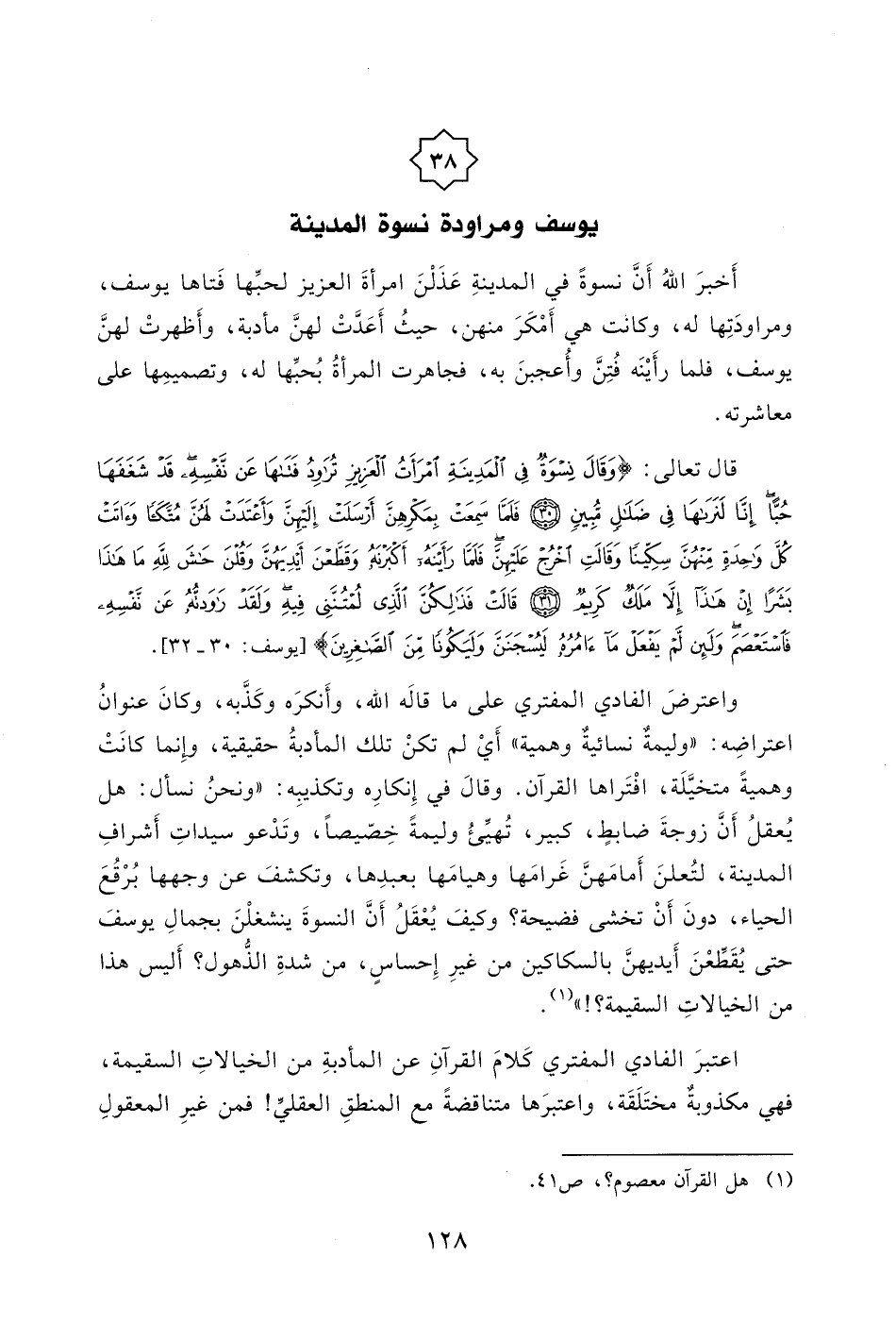إنه جاء فى سورة يوسف أن امرأة العزيز هيأت وليمة لبعض السيدات وأنهن قطعن أيديهن. وهذا غير معقول.