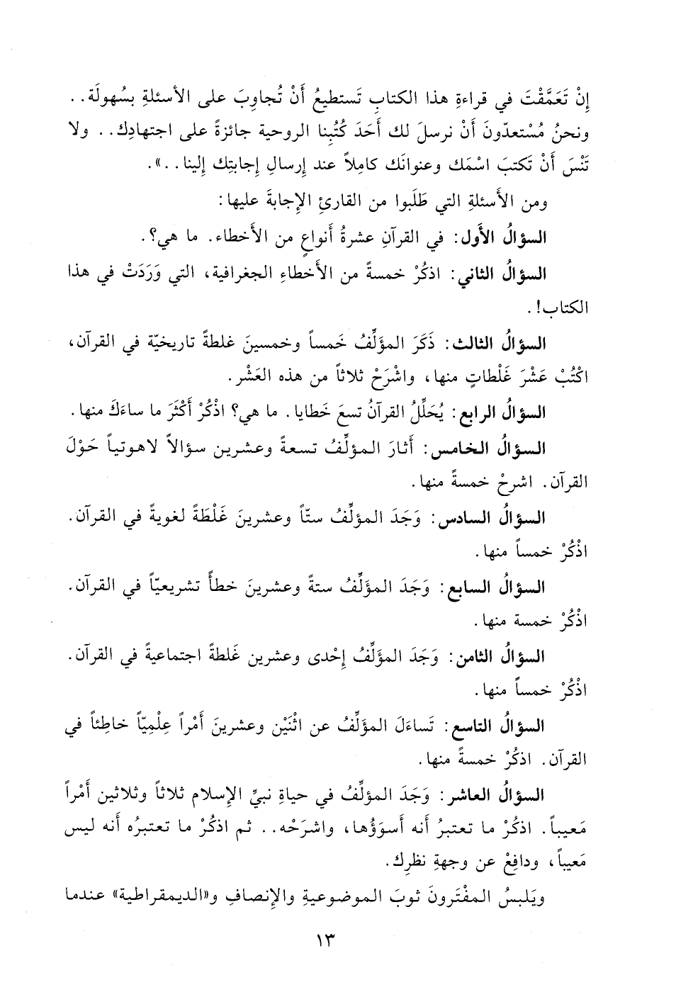 السؤالُ الثالث: ذَكَرَ المؤَلِّفُ خَمساً وخمسينَ غلطةً تاريخيّة في القرآن،