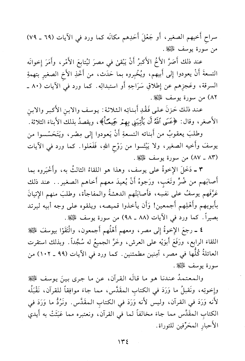 وإِخوتِه، ونَقبلُ ما وَرَدَ في الكتابِ المقَدَّس، مما جاءَ موافِقاً للقرآن، نَقْبَلُه