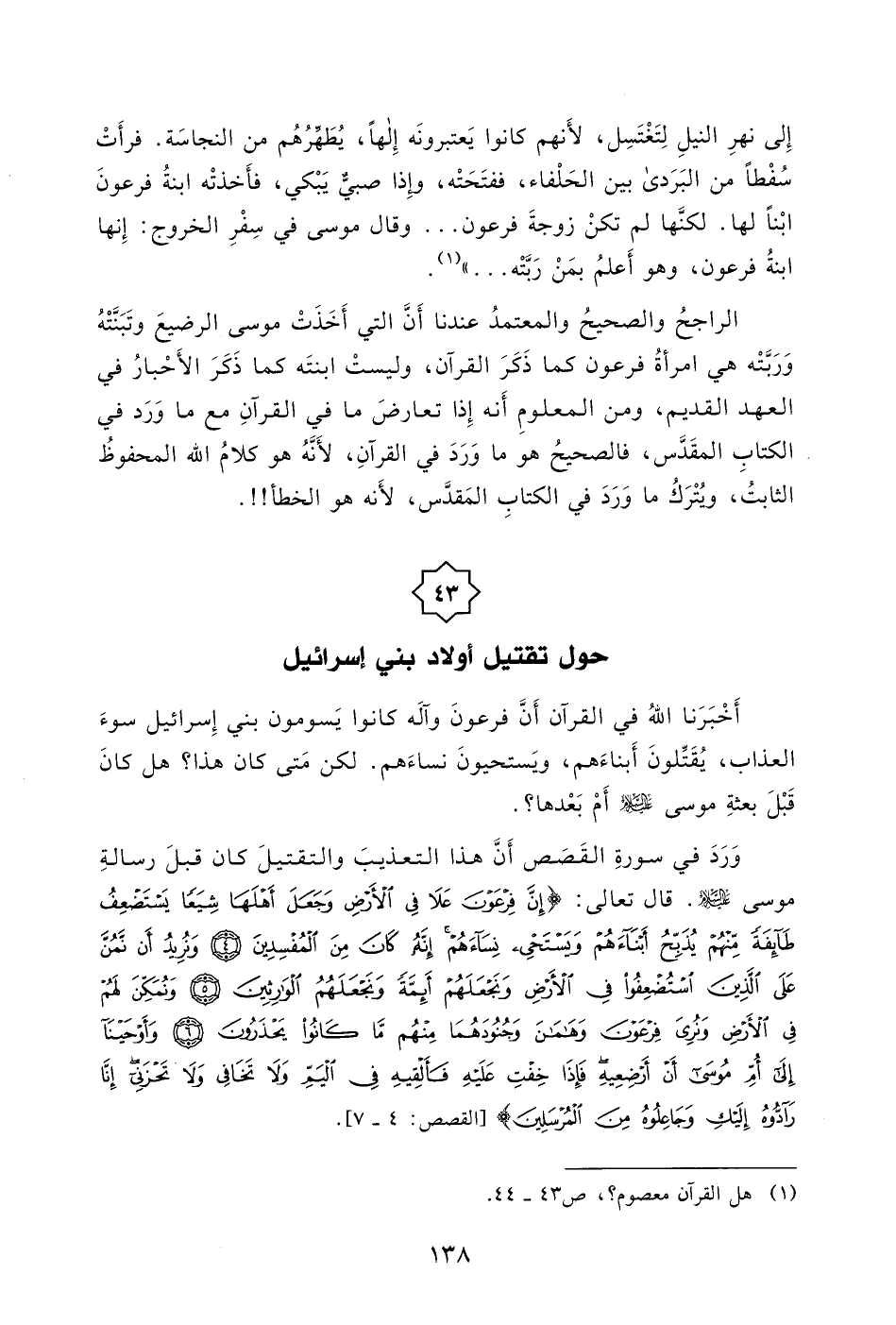 إن فى القرآن أن امرأة فرعون هى التى التقطت موسى - عليه السلام - ويقول: إن فى التوراة أن الملتقطة له هى ابنة فرعون وليست امرأته. وهذا تناقض.