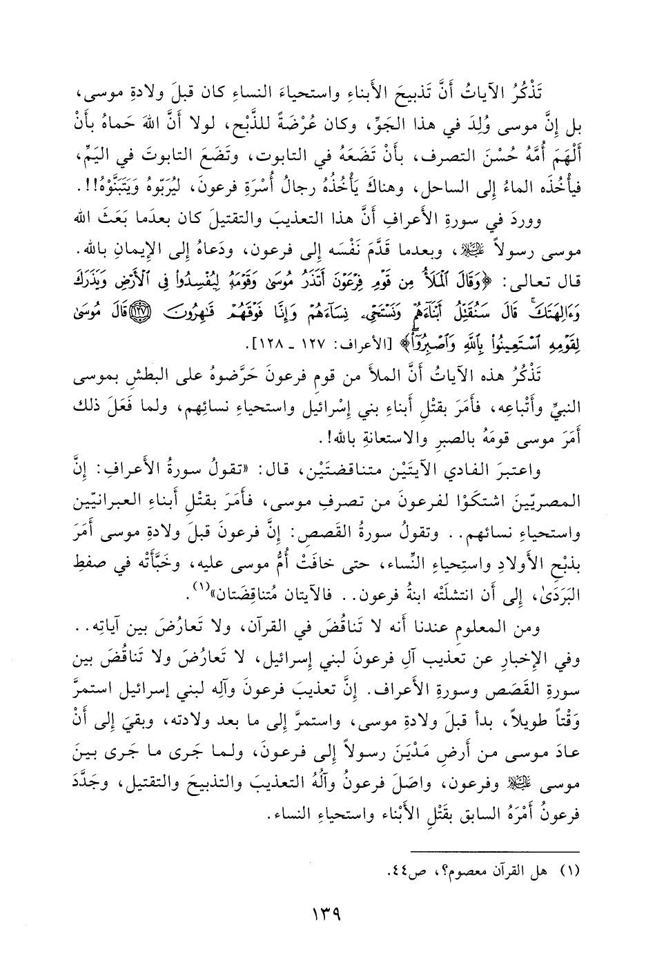 وفى سورة القصص: أن قتل الأبناء واستحياء النساء كانا من قبل ولادة موسى وهذا تناقض.