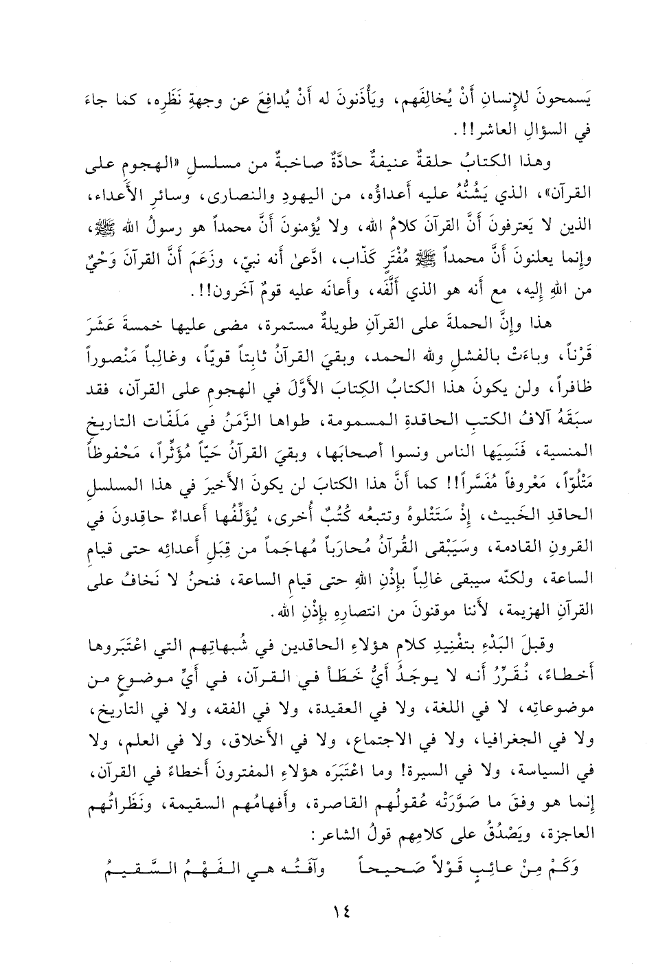 مَتْلُوّاً، مَعْروفاً مُفَسَّراً!! كما أَنَ هذا الكتابَ لن يكونَ الأَخيرَ في هذا المسلسلِ الحاقدِ الخَبيث، إِذْ سَتَتْلوهُ وتتبعُه كُتُبٌ أُخرى، يُؤَلِّفُها أَعداءٌ حاقِدونَ في القرونِ القادمة، وسَيَبْقى القُرآنُ مُحارَباً مُهاجَماً من قِبَلِ أَعدائِه حتى قيامِ الساعة، ولكنّه سيبقى غالِباً بإِذْنِ اللهِ حتى قيامِ الساعة، فنحنُ لا نَخافُ على القرآنِ الهزيمة، لأَننا موقنونَ من انتصارِهِ بإِذْنِ الله.