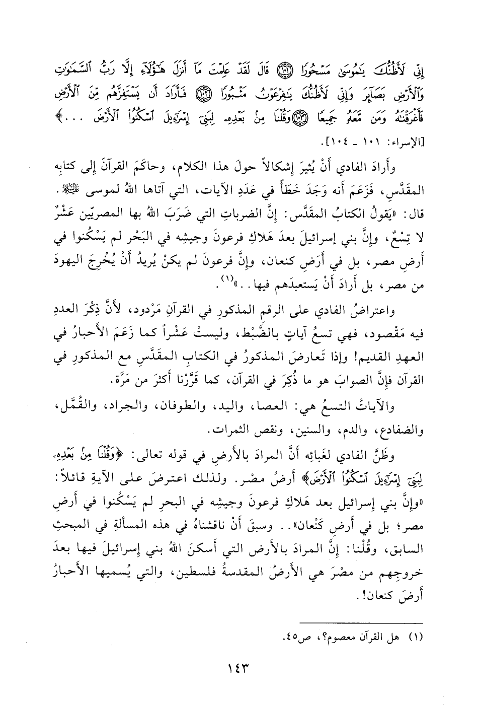 ولذلك اعترضَ على الآيةِ قائلاً: " وإِنَ بني إِسرائيل بعد هَلاكِ فرعونَ وجيشِه في البحرِ لم يَسْكُنوا في أَرضِ مصر؟ بل في أَرضِ كَنْعان "..