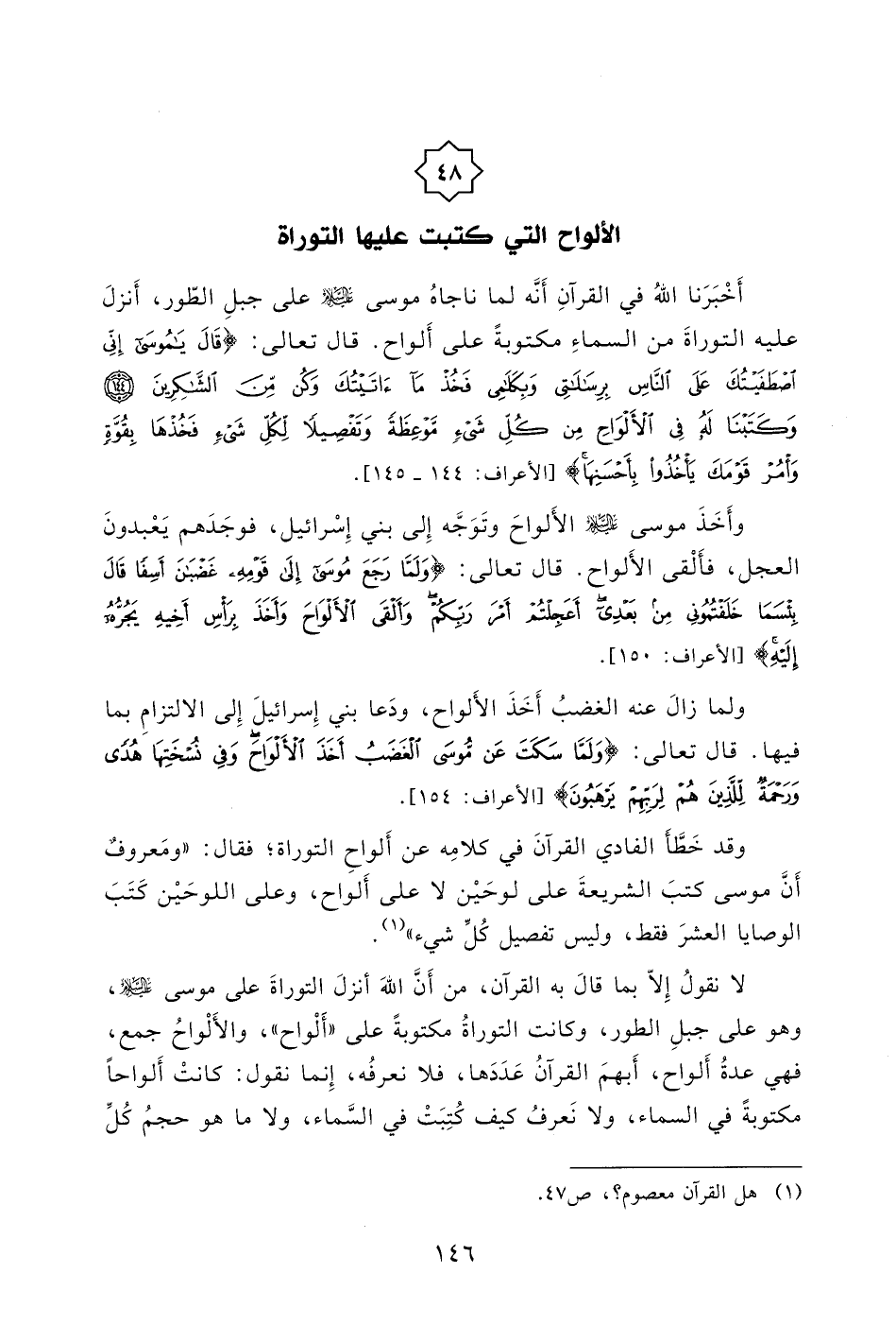 لا نقول إِلاّ بما قال به القرآن، من أَنَّ اللهَ أنزل التوراةَ على موسى - صلى الله عليه وسلم -، وهو على جبلِ الطور، وكانت التوراةُ مكتوبةً على " أَلْواح "، والأَلْواحُ جمع، فهي عدةُ أَلواح، أَبهمَ القرآنُ عَدَدَها، فلا نعرفُه، إِنما نقول: كانتْ أَلواحاً مكتوبةً في السماء، ولا نَعرفُ كيف كُتِبَتْ في السَّماء، ولا ما هو حجمُ كُلِّ