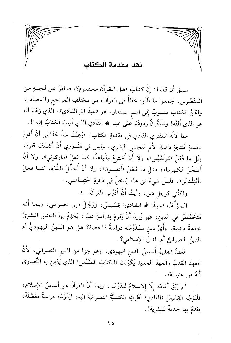 ولكنَ الكتابَ منسوبٌ إِلى اسمٍ مستعار، هو " عبدُ اللهِ الفادي "، الذي زَعَمَ أَنه هو الذي أَلَّفَه! وسَتَكُونُ ردودُنا على عبد الله الفادي الذي نُسِبَ الكتابُ إليه!!.