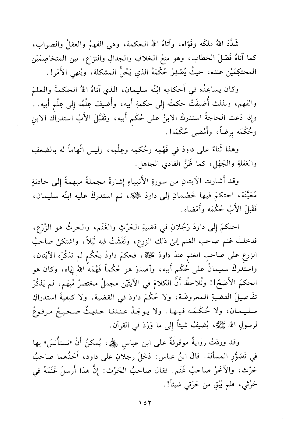 فدخلتْ غنم صاحب الغنم إلئ ذلك الزرع، ونَفَشَتْ فيه لَيْلاً، واشتكى صاحبُ الزرعِ على صاحبِ الغنمِ عندَ داودَ - صلى الله عليه وسلم -، فحكمَ داودُ بحُكْمٍ لم تذكُرْه الآيَتان، واستدركَ سليمانُ على حُكْم أَبيه، وأصدرَ هو حُكْماً فَهَّمَه اللهُ إِيّاه، وكان هو الحكمَ الأَصَحّ!! ونُلاحظُ أَنَّ الكلامَ في الآيتيْن مجملٌ مختصرٌ مُبْهَم، لم يَذكُرْ تفَاصيلَ القضيةِ المعروضَة، ولا حُكْمَ داودَ في القضية، ولا كيفيةَ استدراكِ سليمان، ولا حُكْمَه فيها.