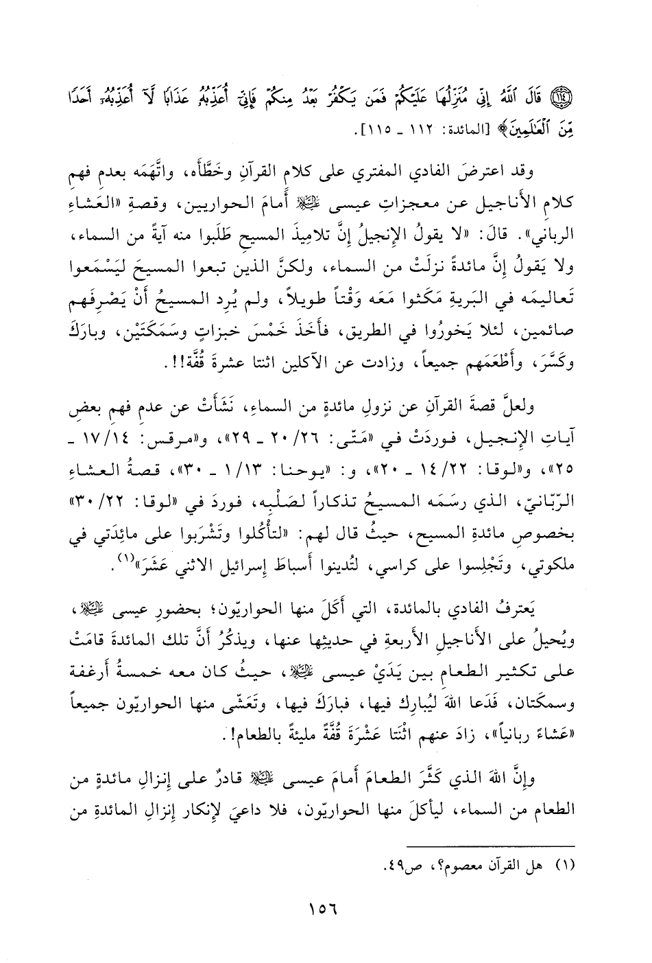 بحضورِ عيسى - عليه السلام -، ويُحيلُ على الأَناجيلِ الأَربعةِ في حديثِها عنها، ويذكُرُ أَنَّ تلك المائدةَ قامَتْ على تكثير الطعامِ بين يَدَيْ عيسى - عليه السلام -، حيثُ كان معه خمسةُ أَرغفة وسمكَتان، فَدَعا اللهَ ليُبارِك فيها، فبارَكَ فيها، وتَعَشّى منها الحواريّون جميعاً " عَشاءً ربانياً "، زادَ عنهم اثْنَتا عَشْرَةَ قُفَّةً مليئةً بالطعام!.