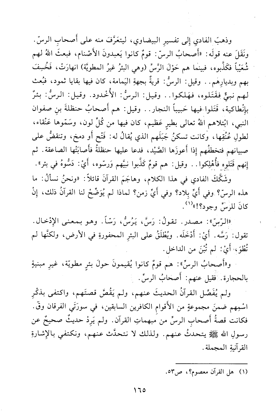 وذهب الفادي إِلى تفسيرِ البيضاوي، ليتعَرَّفَ منه على أَصحابِ الرسّ.