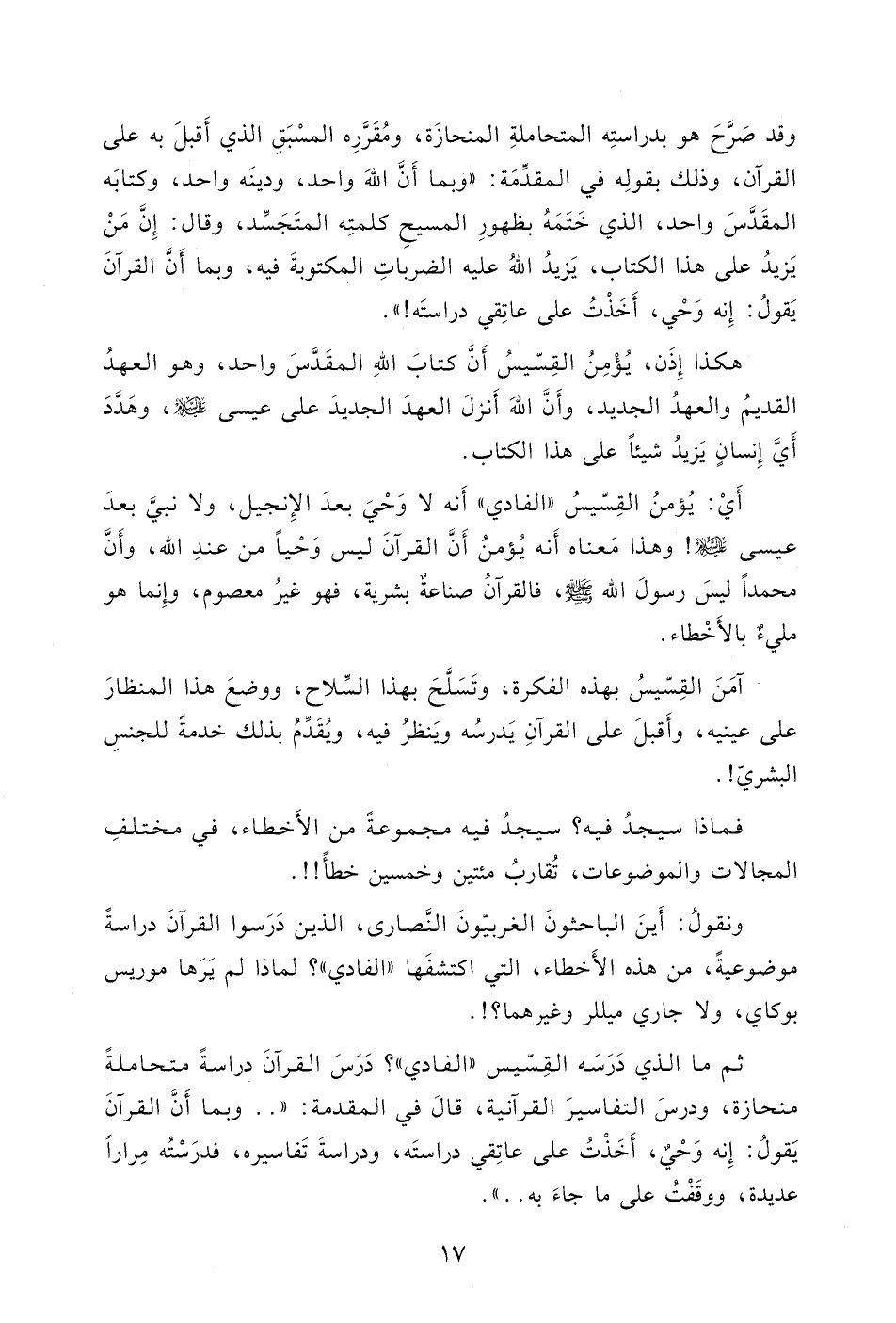 القرآن، وذلك بقولِه في المقدِّمَة: " وبما أَنَّ اللهَ واحد، ودينَه واحد، وكتابَه المقَدَّسَ واحد، الذي خَتَمَهُ بظهورِ المسيحِ كلمتِه المتَجَسِّد، وقال: إِنَّ مَنْ يَزيدُ على هذا الكتاب، يَزيدُ اللهُ عليه الضرباتِ المكتوبةَ فيه، وبما أَنَّ القرآنَ يَقول: إِنه وَحْي، أَخَذْتُ على عاتِقي دراستَه! ".