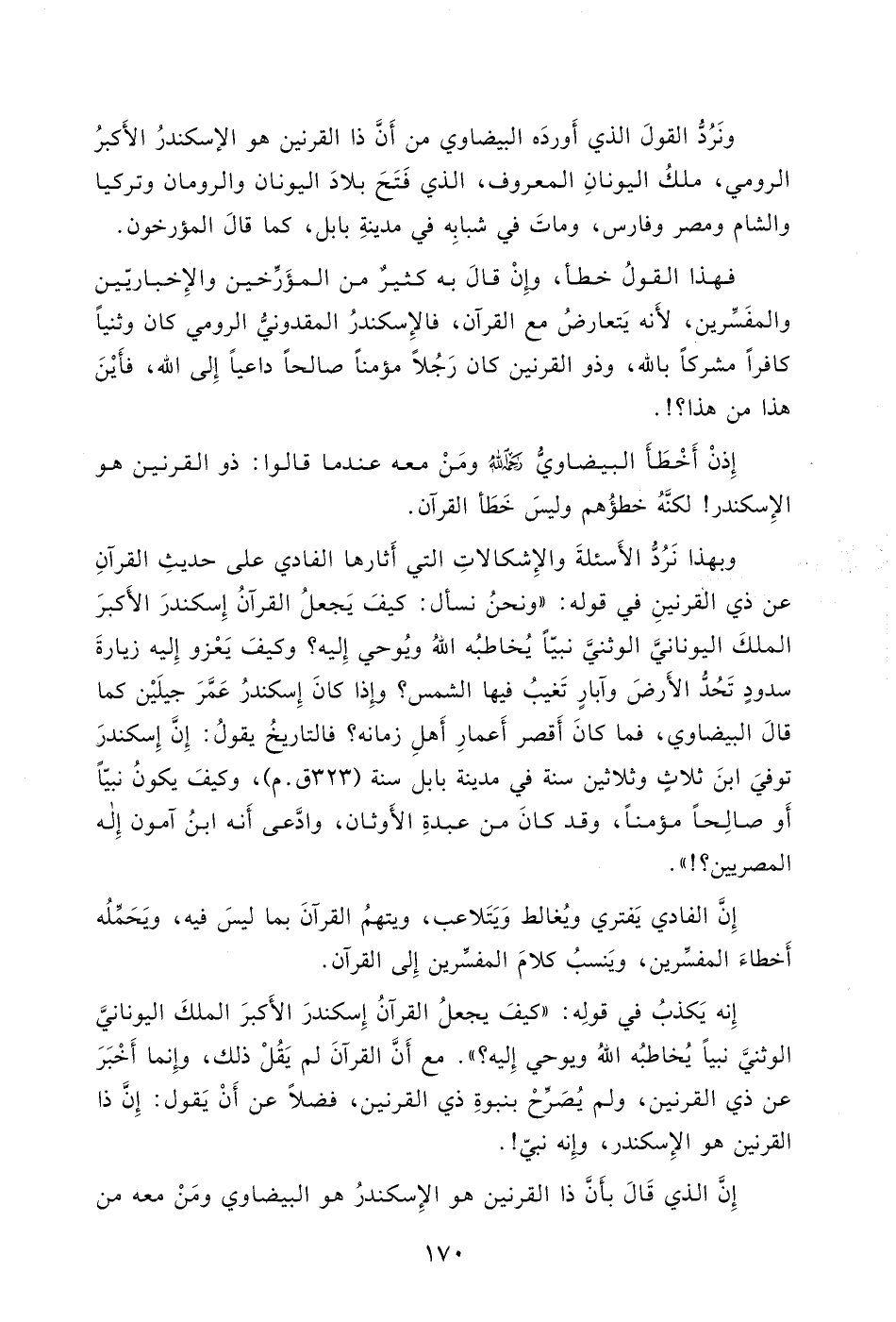 فالتاريخُ يقول: إِنَّ إِسكندرَ توفيَ ابنَ ثلاثٍ وثلاثين سنة في مدينة بابل سنة (323 ق. م) ، وكيفَ يكونُ نبيّاً أَو صالِحاً مؤمناً، وقد كانَ من عبدةِ الأَوثان، وادَّعى أَنه ابنُ آمون إِله المصريين؟! ".