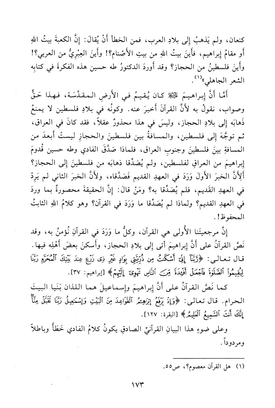 كنعان، ولم يَذهبْ إِلى بلادِ العرب، فمن الخطأ أَنْ يُقالَ: إِنَّ الكعبةَ بيتُ اللهِ أَو مقامُ إِبراهيم، فأَينَ بيتُ اللهِ من بيتِ الأَصْنام؟!