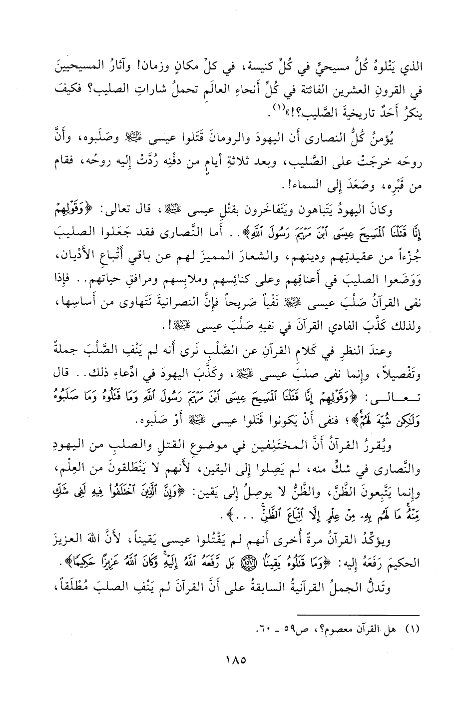 فإِذا نفى القرآنُ صَلْبَ عيسى - عليه السلام - نَفْياً صَريحاً فإِنَ النصرانيةَ تَتَهاوى من أَساسِها، ولذلك كَذَّبَ الفادي القرآنَ في نفيهِ صَلْبَ عيسى - عليه السلام -.