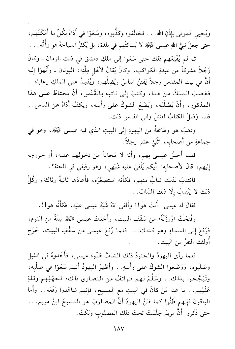 وفُتِحَتْ " رُوزَنَة " من سَقْفِ البيتِ، وأَخَذَتْ عيسى - عليه السلام - سِنَة من النوم، فرُفعَ إِلى السماءِ وهو كذلك ...