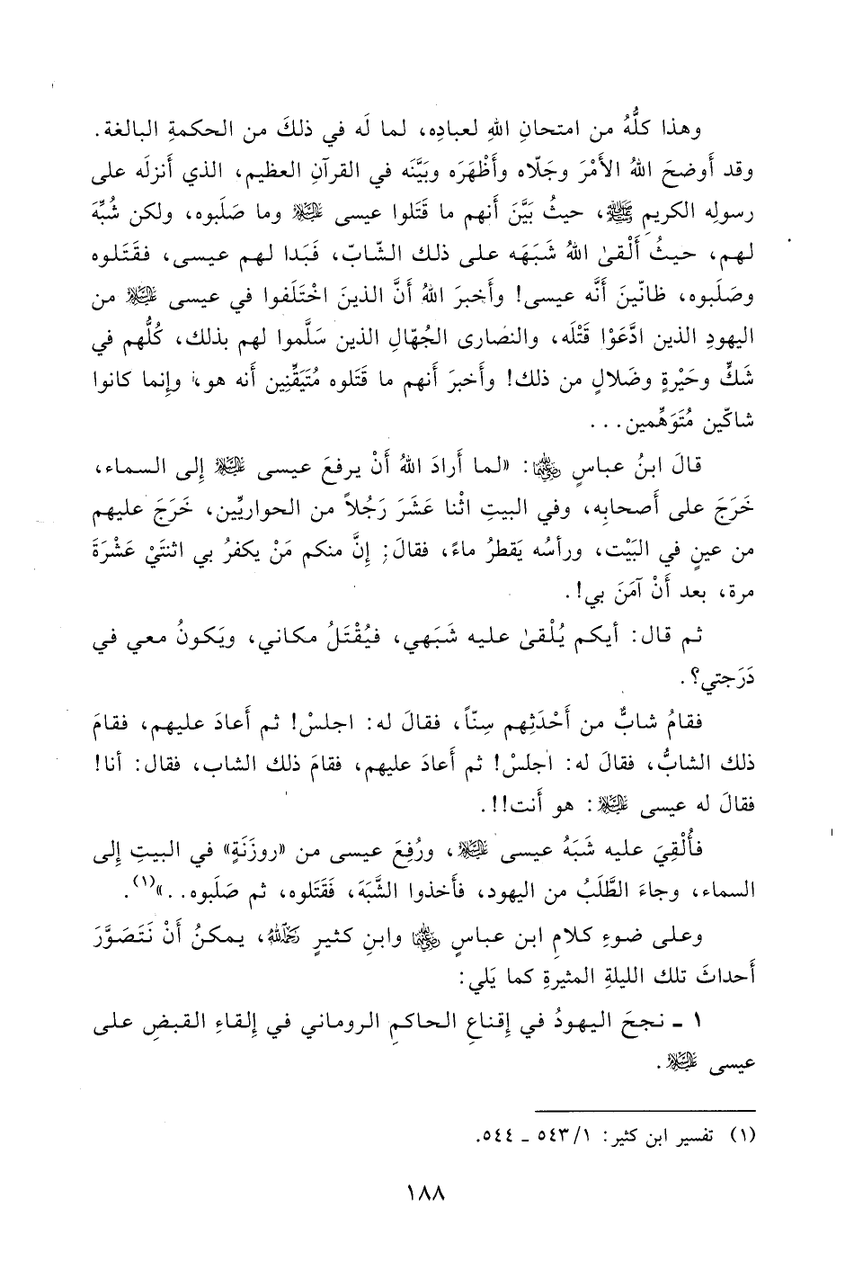 فأُلْقِيَ عليه شَبَهُ عيسى - عليه السلام -، ورُفِعَ عيسى من " روزَنَةٍ " في البيتِ إِلى السماء، وجاءَ الطَّلَبُ من اليهود، فأَخذوا الشَّبَهَ، فَقَتَلوه، ثم صَلَبوه.. ".