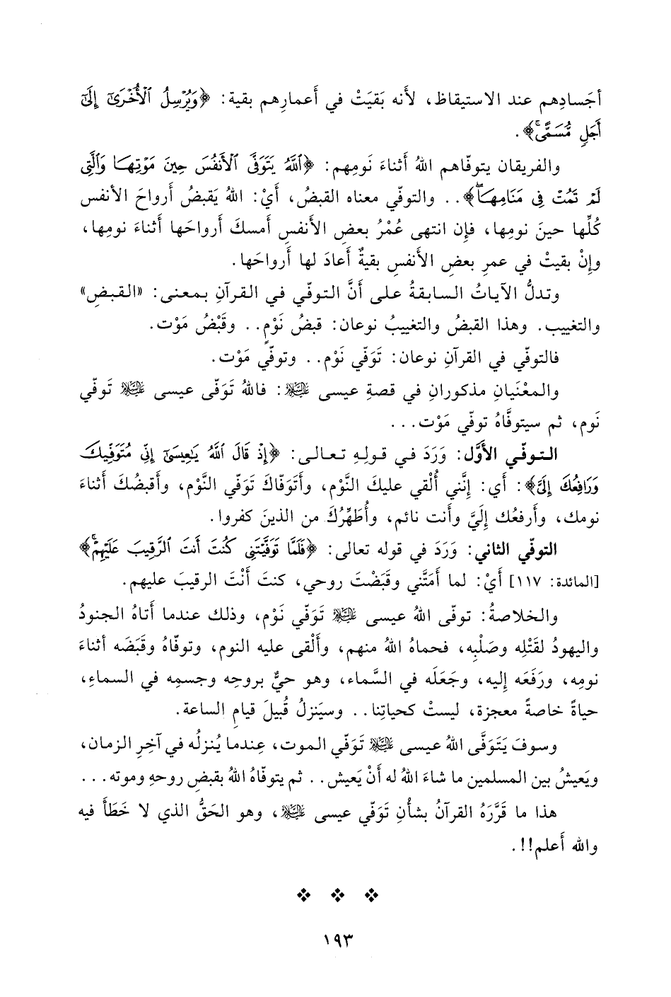 والخلاصةُ: توفّى اللهُ عيسى - عليه السلام - تَوَفي نَوْم، وذلك عندما أَتاهُ الجنودُ واليهودُ لقَتْلِه وصَلْبِه، فحماهُ اللهُ منهم، وأَلْقى عليه النوم، وتوفّاهُ وقَبَضَه أثناءَ نومِه، ورَفَعَه إِليه، وجَعَلَه في السَّماء، وهو حيّ بروحِه وجسمِه في السماءِ، حياةً خاصةً معجزة، ليستْ كحياتِنا..