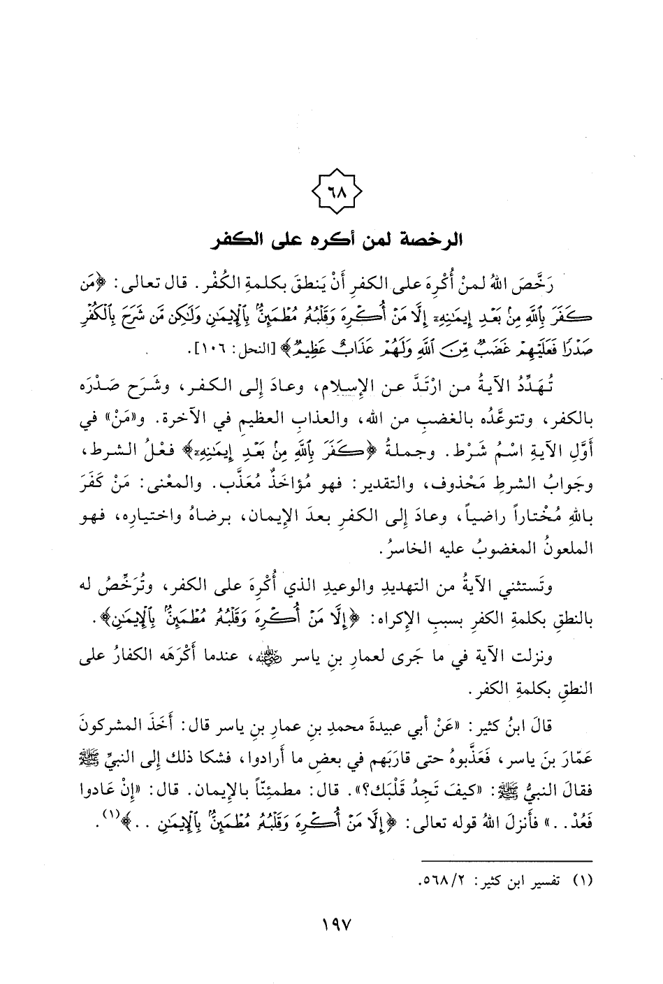 " فأَنزلَ اللهُ قوله تعالى: (إِلَّا مَنْ أُكْرِهَ وَقَلْبُهُ مُطْمَئِنٌّ بِالْإِيمَانِ) ..