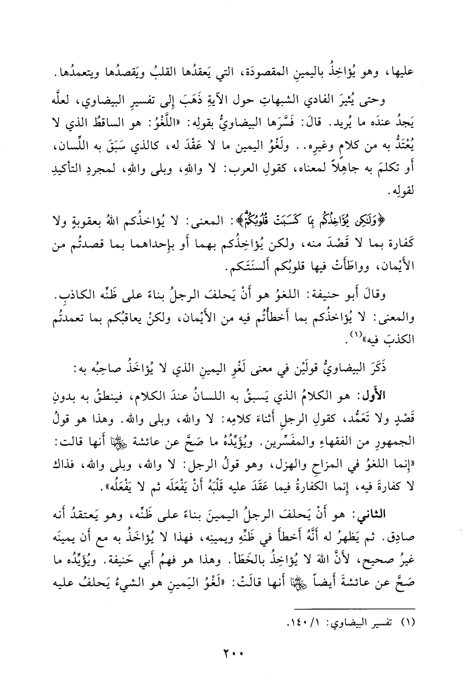ذَكَرَ البيضاويُّ قولَيْن في معنى لَغْوِ اليمينِ الذي لا يُؤاخَذُ صاحِبُه به: