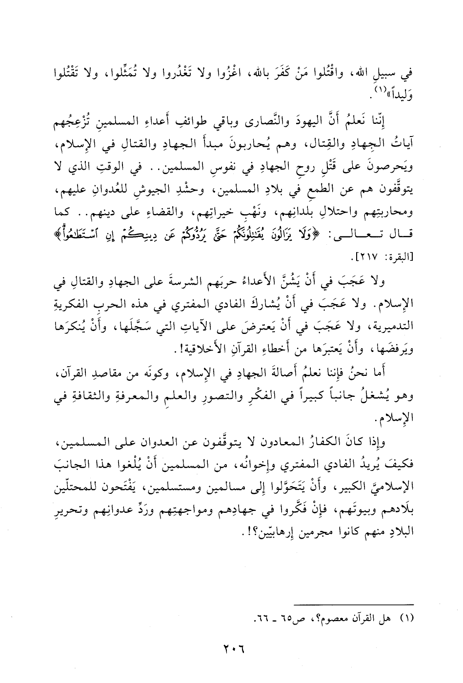 أَما نحنُ فإِننا نعلمُ أَصالةَ الجهادِ في الإِسلام، وكونَه من مقاصدِ القرآن،