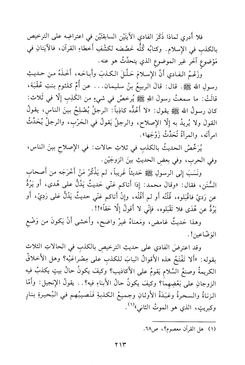 وقد اعترضَ الفادي على حديثِ الترخيصِ بالكذبِ في الحالاتِ الثلاث