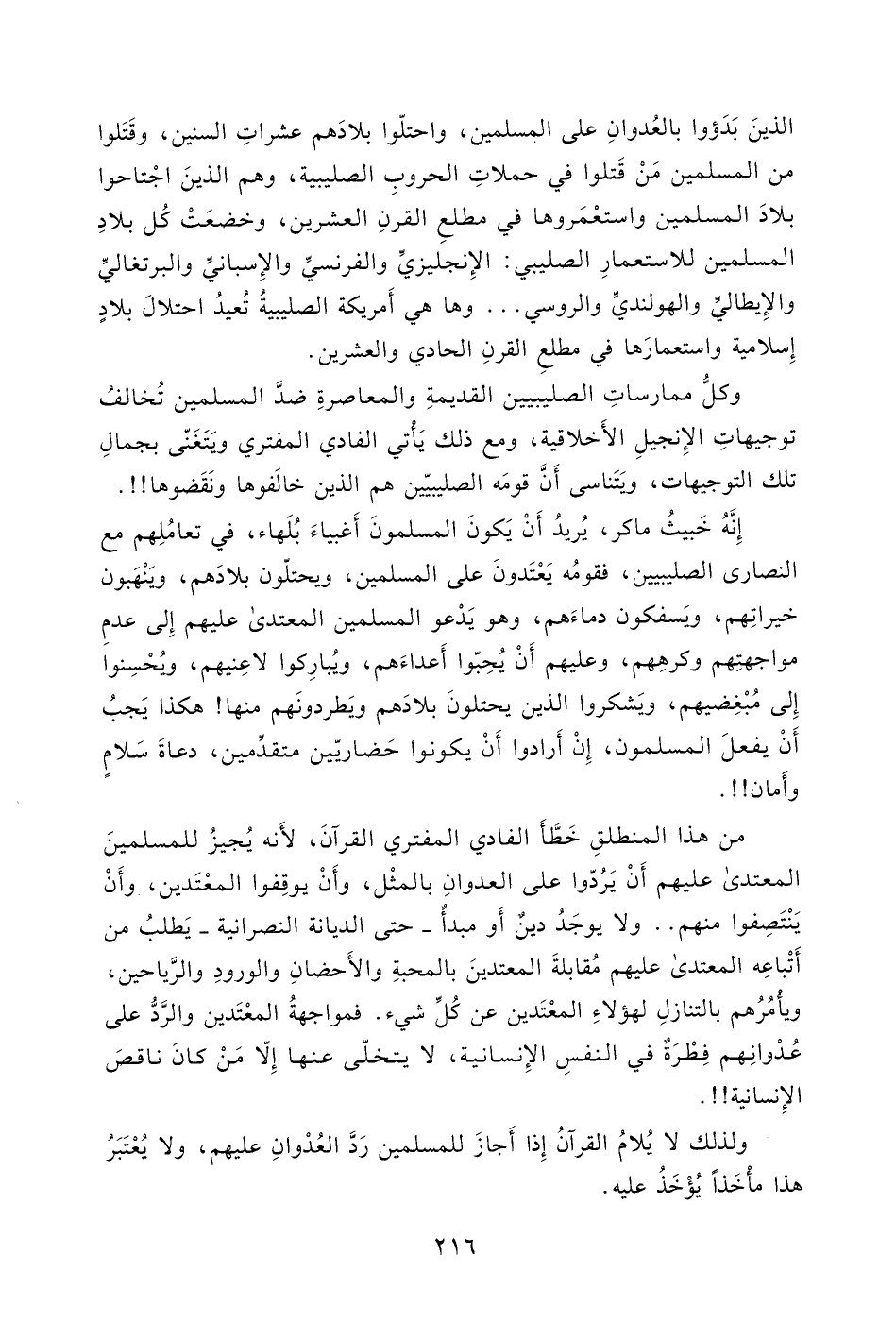 النصارى الصليبيين، فقومُه يَعْتَدونَ على المسلمين، ويحتلّون بلادَهم، ويَنْهَبون خيراتِهم، ويَسفكون دماءَهم، وهو يَدْعو المسلمين المعتدى عليهم إِلى عدمِ مواجهتِهم وكرهِهم، وعليهم أَنْ يُحِبّوا أَعداءَهم، ويُبارِكوا لاعِنيهم، ويُحْسِنوا إِلى مُبْغِضيهم، ويَشكروا الذين يحتلونَ بلادَهم ويَطردونَهم منها! هكذا يَجبُ أَنْ يفعلَ المسلمون، إِنْ أَرادوا أَنْ يكونوا حَضاريّين متقدمين، دعاةَ سَلامِ وأَمان!!.