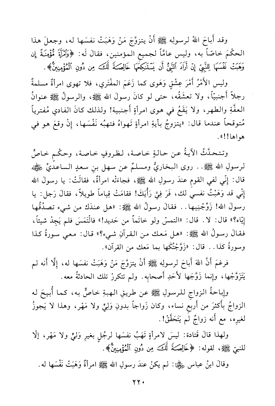 وقد أَباحَ اللهُ لرسولِه - صلى الله عليه وسلم - أَنْ يتزوَّجَ مَنْ وَهَبَتْ نفسَها له، وجعلَ هذا الحكْمَ خاصّاً به، وليس عامَّاً لجميع المؤمنين، فقالَ لَه: (وَامْرَأَةً مُؤْمِنَةً إِنْ وَهَبَتْ نَفْسَهَا لِلنَّبِيِّ إِنْ أَرَادَ النَّبِيُّ أَنْ يَسْتَنْكِحَهَا خَالِصَةً لَكَ مِنْ دُونِ الْمُؤْمِنِينَ) .