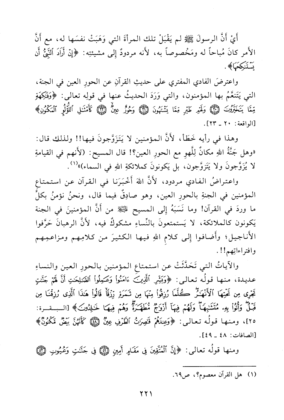 ما وردَ في القرآن! وما نَسَبَهُ إِلى المسيح - عليه السلام - من أَنَّ المؤمنينَ في الجنة يَكونون كالملائكة، لا يَستمتعونَ بالنِّساءِ مشكوكٌ فيه (1) ، لأَنَّ الرهبانَ حَرَّفوا الأَناجيل " وأَضافوا إِلى كلامِ اللهِ فيها الكثيرَ من كلامِهم ومزاعمِهم وافتراءاتِهم!!.