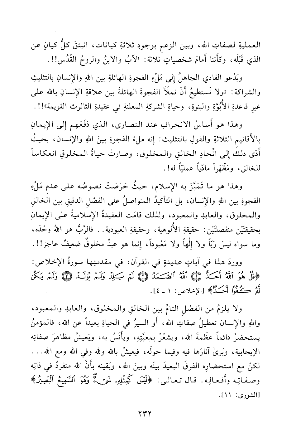 الفجوةِ بين اللهِ والإِنسان، بل التأكيدُ المتواصلُ على الفصلِ الدقيقِ بين الخالقِ والمخلوق، والعابدِ والمعبود، ولذلك قامَت العقيدةُ الإِسلاميةُ على الإِيمانِ بحقيقتَيْن منفصلتَيْن: حقيقةِ الأُلوهية، وحقيقةِ العبودية..