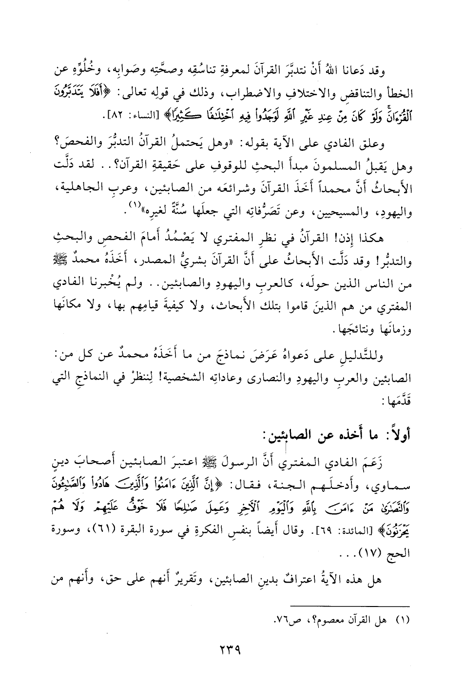 زَعَمَ الفادي المفترِي أَنَّ الرسولَ - صلى الله عليه وسلم - اعتبرَ الصابئين أَصحابَ دينٍ سماوي، وأَدخلَهم الجنة، فقال: (إِنَّ الَّذِينَ آمَنُوا وَالَّذِينَ هَادُوا وَالصَّابِئُونَ وَالنَّصَارَى مَنْ آمَنَ بِاللَّهِ وَالْيَوْمِ الْآخِرِ وَعَمِلَ صَالِحًا فَلَا خَوْفٌ عَلَيْهِمْ وَلَا هُمْ يَحْزَنُونَ (69) .