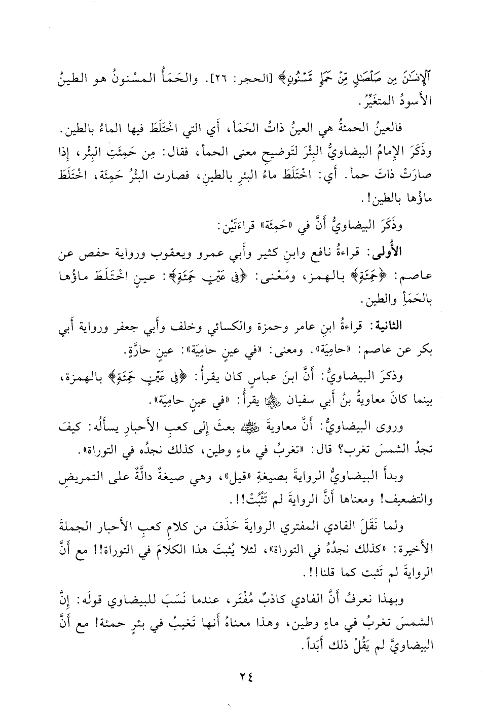 الشمسَ تغربُ في ماءٍ وطين، وهذا معناهُ أَنها تَغيبُ في بئرٍ حمئة! مع أَنَّ