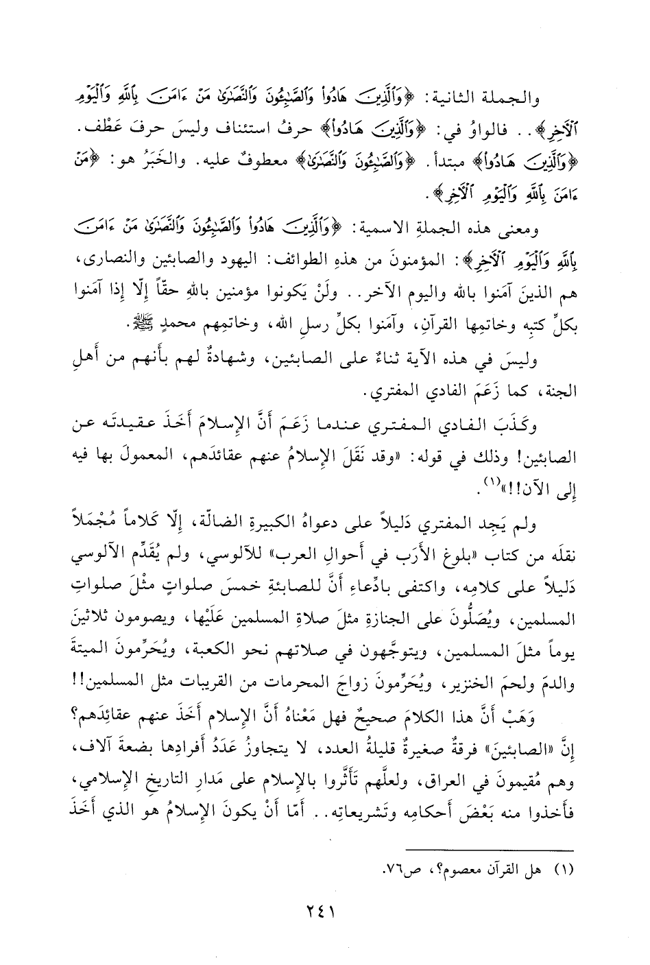 الصابئين! وذلك في قوله: " وقد نَقَلَ الإِسلامُ عنهم عقائدَهم، المعمولَ بها فيه إِلى الآن!! ".