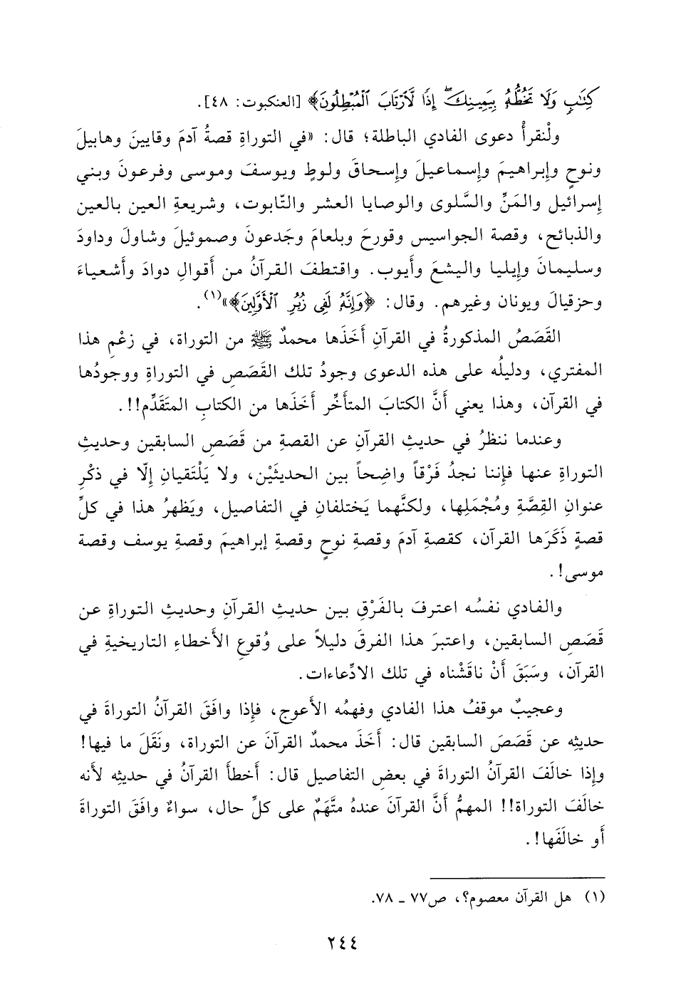 وإِذا خالَفَ القرآنُ التوراةَ في بعضِ التفاصيل قال: أَخطأَ القرآنُ في حديثِه لأَنه خالَفَ التوراة!! المهمّ أَنَّ القرآنَ عندهُ متَّهَمٌ على كلِّ حال، سواءٌ وافَقَ التوراةَ أَو خالَفَها!.