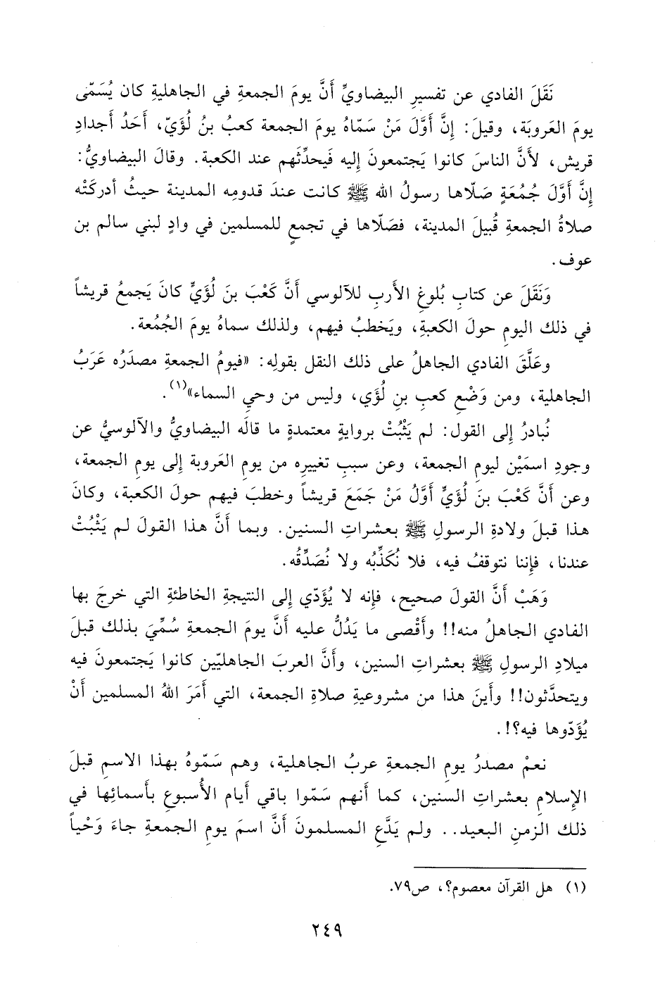 ميلادِ الرسولِ - صلى الله عليه وسلم - بعشراتِ السنين، وأَنَّ العربَ الجاهليّين كانوا يَجتمعونَ فيه ويتحدَّثون ا! وأَينَ هذا من مشروعيةِ صلاةِ الجمعة، التي أَمَرَ اللهُ المسلمين أَنْ يُؤَدّوها فيه؟!.